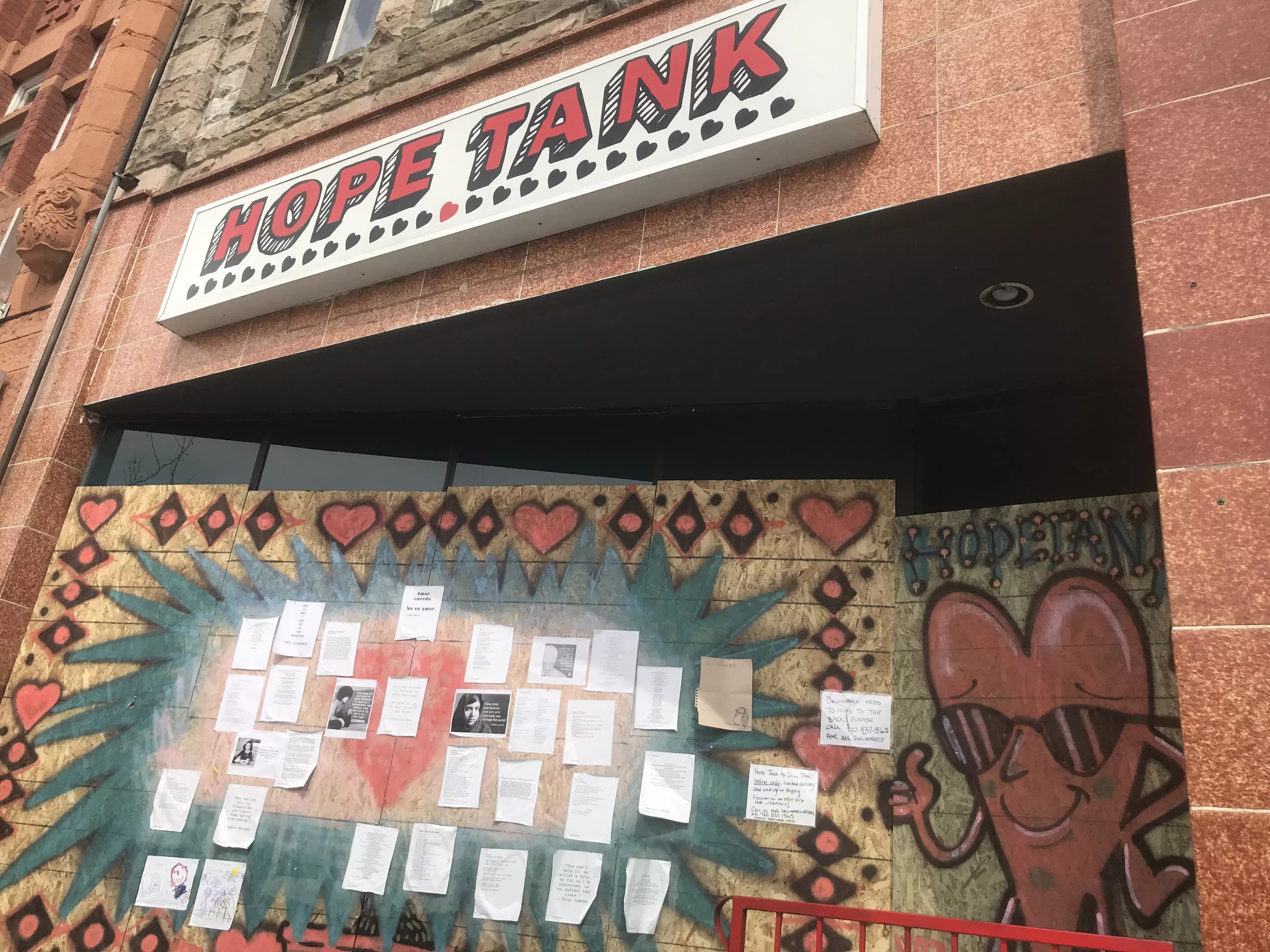 Erika Righter, owner of Hope Tank, closed her Broadway storefront back in March. While she loathed the notion of covering the windows with plain plywood, she feared that if she didn’t, vandals might tag or smash the place…so she decided to hire an artist to paint a mural on the boards. A relentless community organizer, she then encouraged other businesses along Broadway to do the same, offering to connect them with artists in an effort to both keep the neighborhood alive and support friends who are creatives.