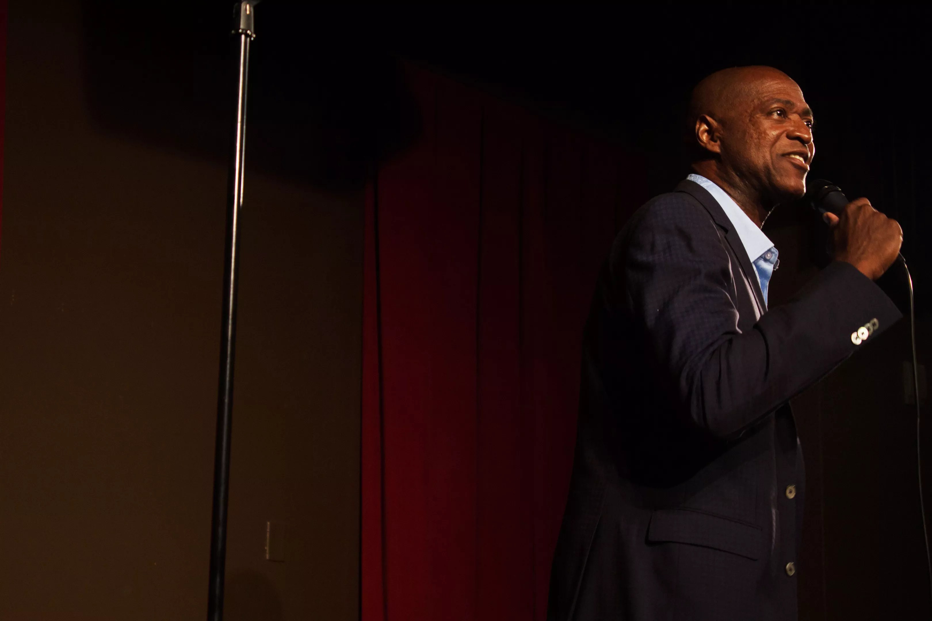 Comedian Sam Adams performing a set for Denver Urban Spectrum’s Comedy Explosion, in 2017, at Comedy Works South.