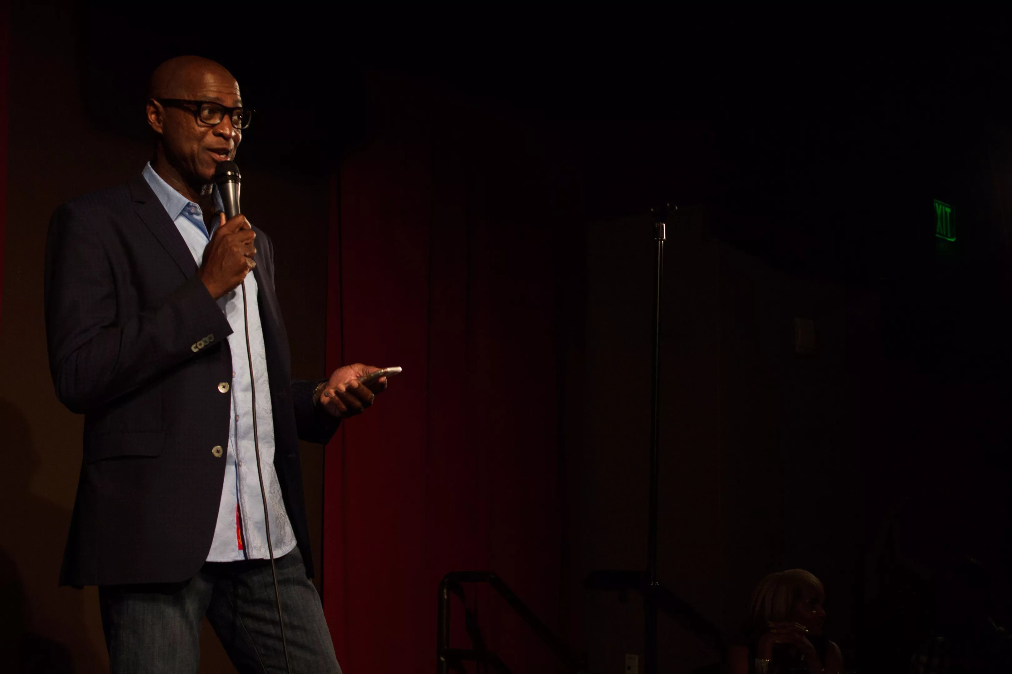 Comedian Sam Adams performing a set for Denver Urban Spectrum’s Comedy Explosion, in 2017, at Comedy Works South.