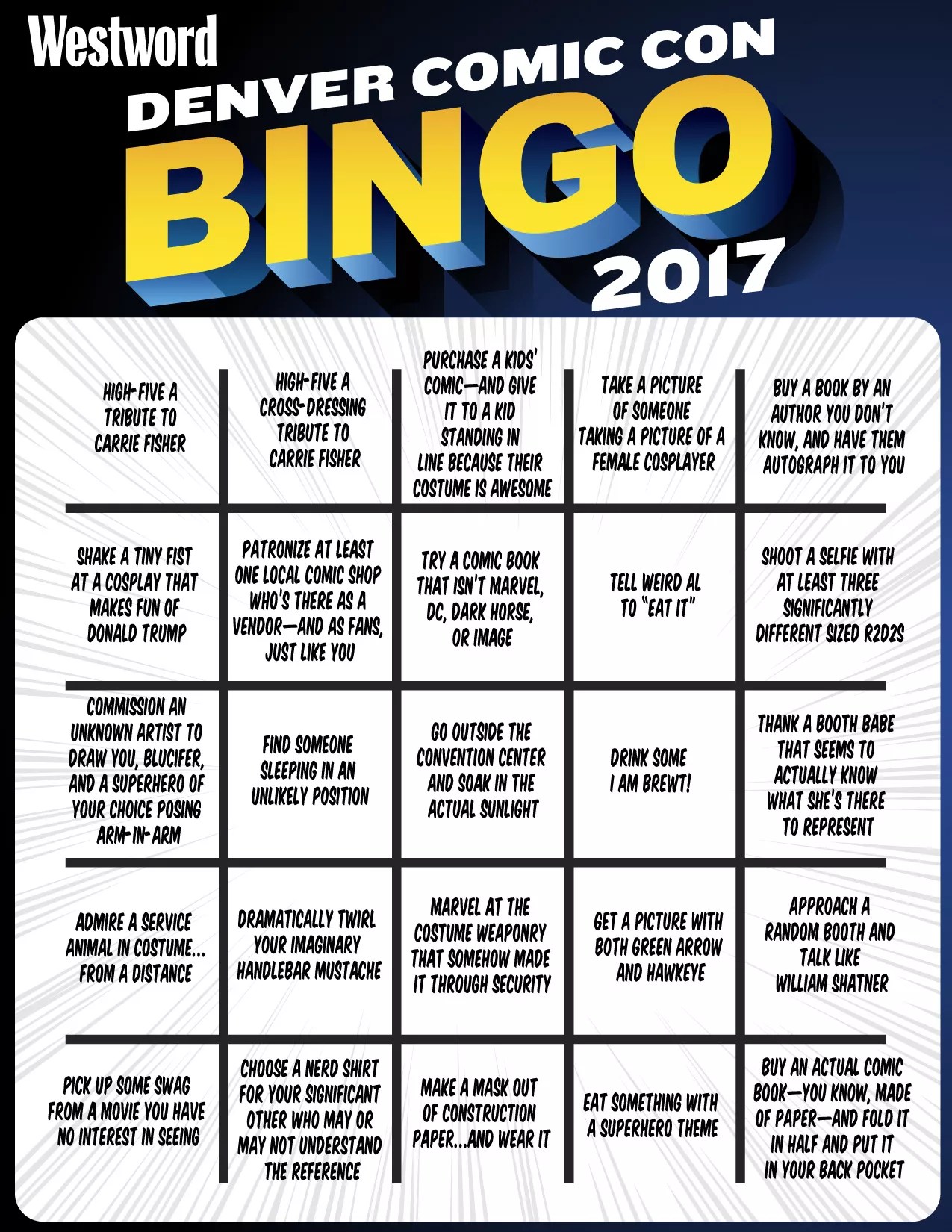 In order to keep track of all the awesomeness, we’ve created another handy Denver Comic Con Bingo card (we started the tradition with the Denver Comic Con 2016 bingo card). Print it out and play with your friends – you know, while you’re waiting in line.