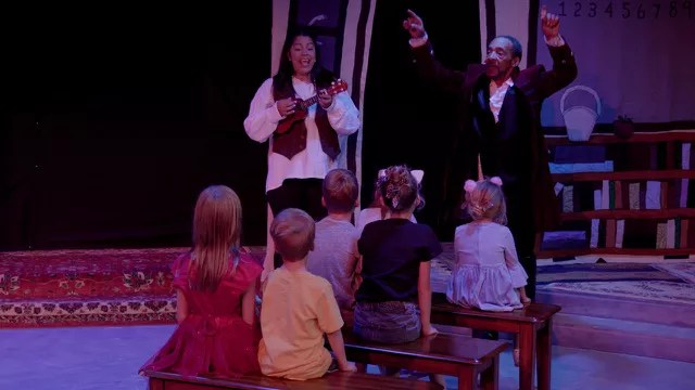 Paolo Miranda and Alex Crawford with kids from the audience in The Legend of Sleepy Hollow at Miners Alley Playhouse.