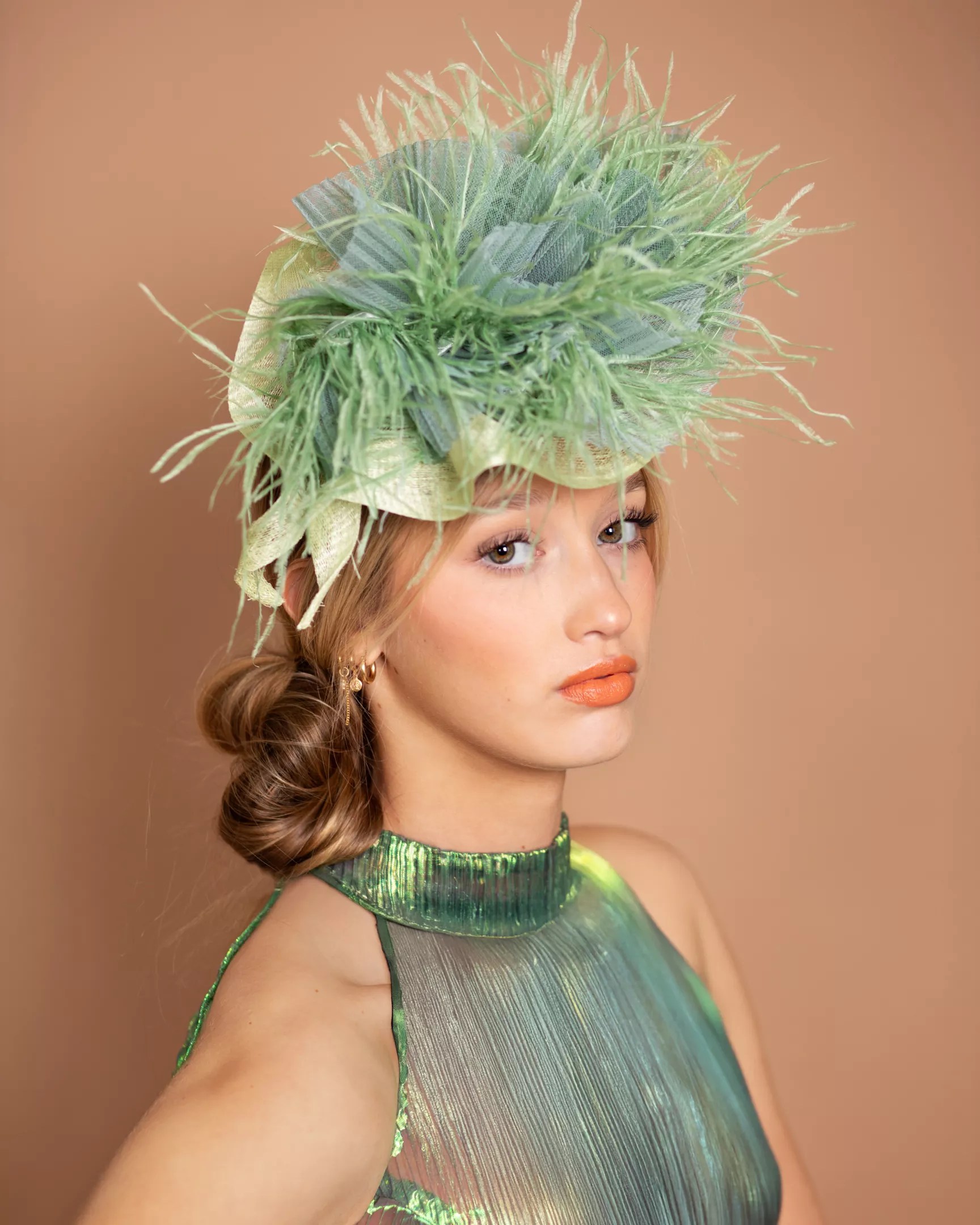 She says people used to ask for a lot of clip-on fascinator hats, but lately more people want something a little larger, such as a saucer or slice hat, which is a flat, circular or oval shape resembling a small plate. They also request a percher hat, which sits angled on the head, often tilted toward the forehead.