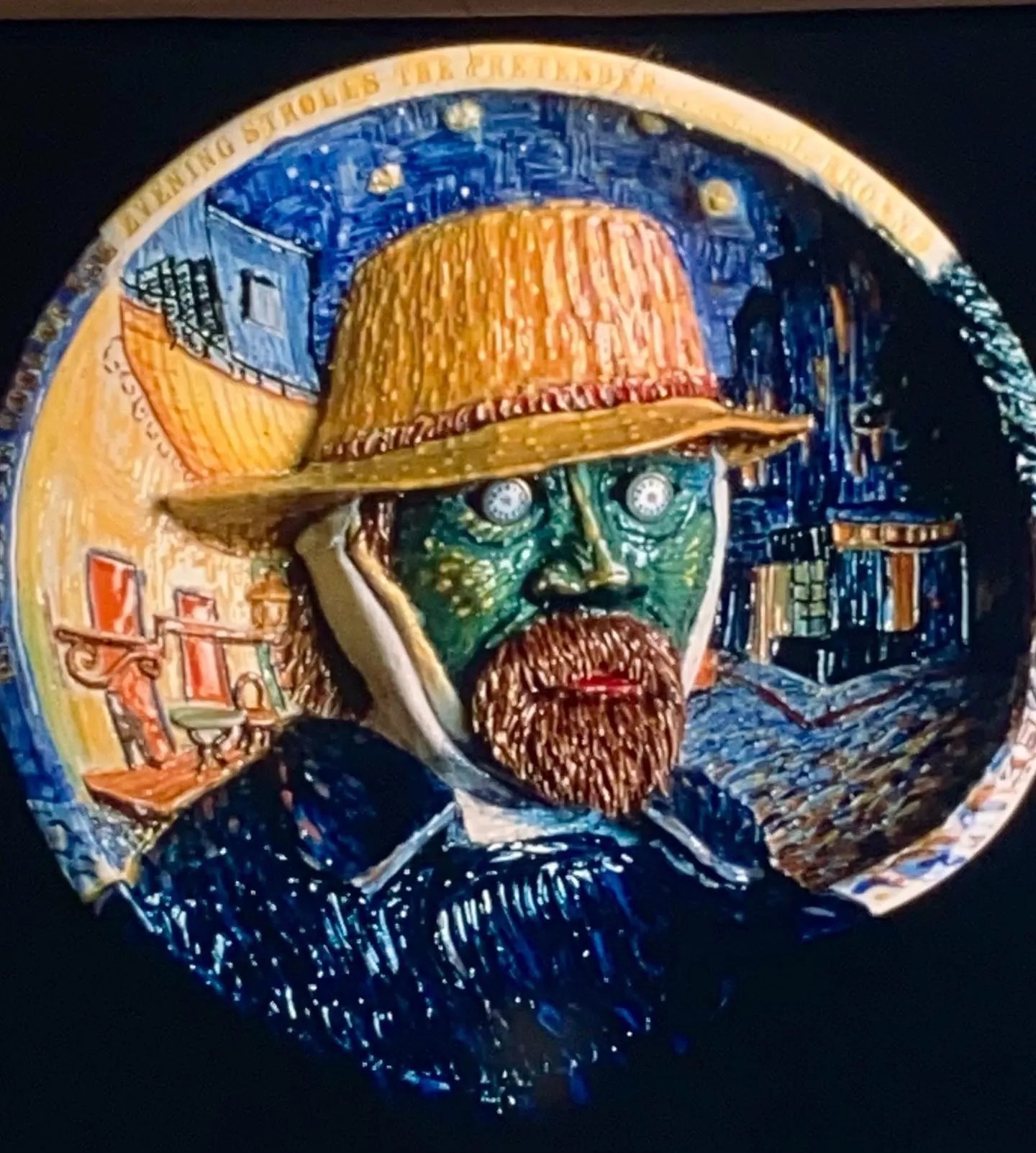 A van Gogh sculptural bowl portrait by John Aaron, Della Robbia-style three-dimensional glazed relief, mixed media.