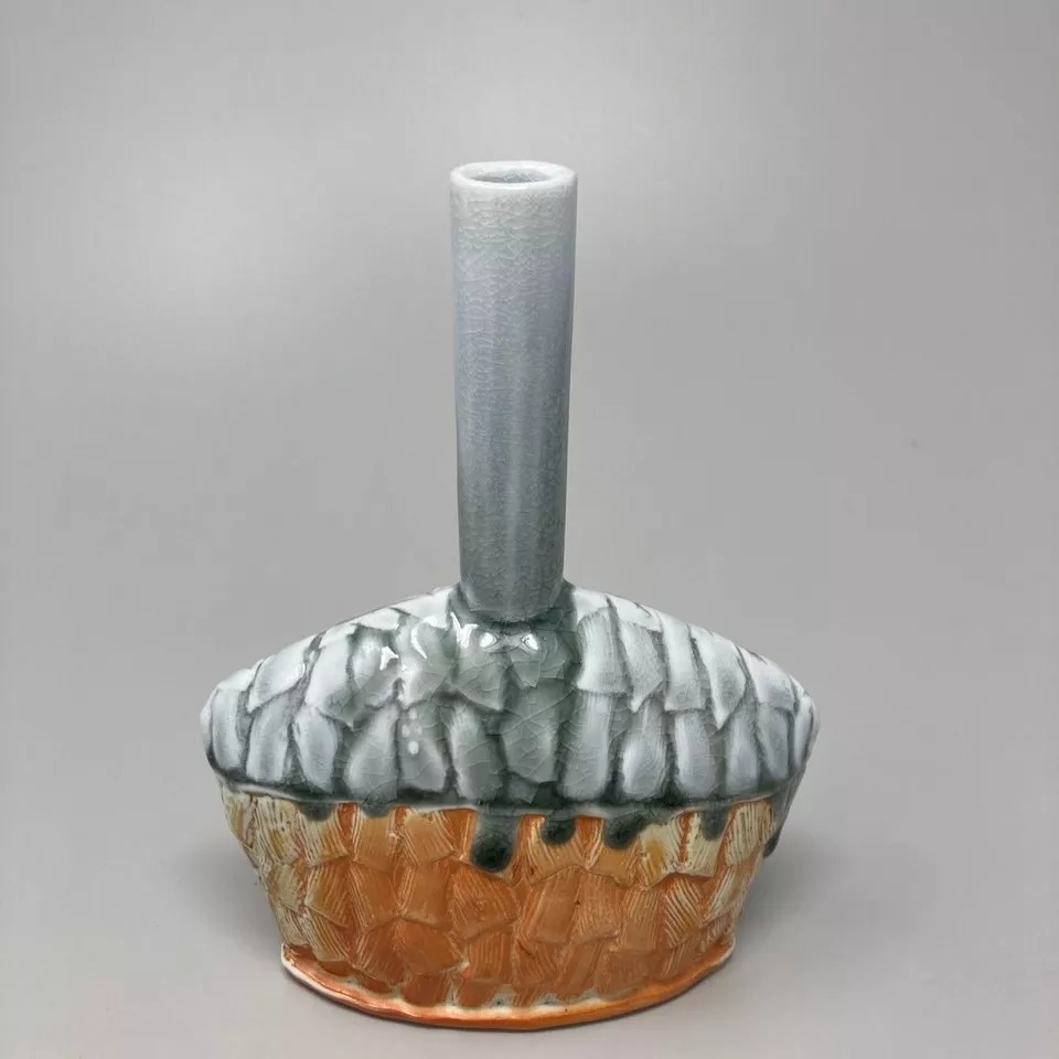 Richard Burkett, whose show Wine, Roses (and soda) opened in July, will have ceramic works on display, primarily soda-fired porcelain pieces, at RiNo’s Plinth Gallery through the end of the month. The versatile potter makes both functional vessels and purely sculptural work with unusual surfaces and coloring, is also an author and so deeply engaged in the art and science of ceramic glazes that he’s created a glaze calculation software called Hyperglaze.