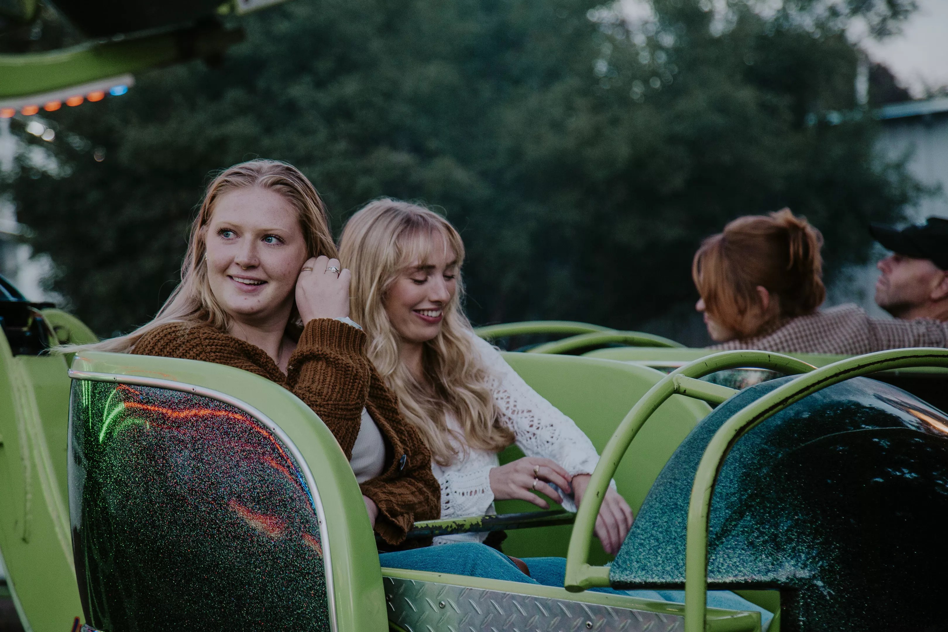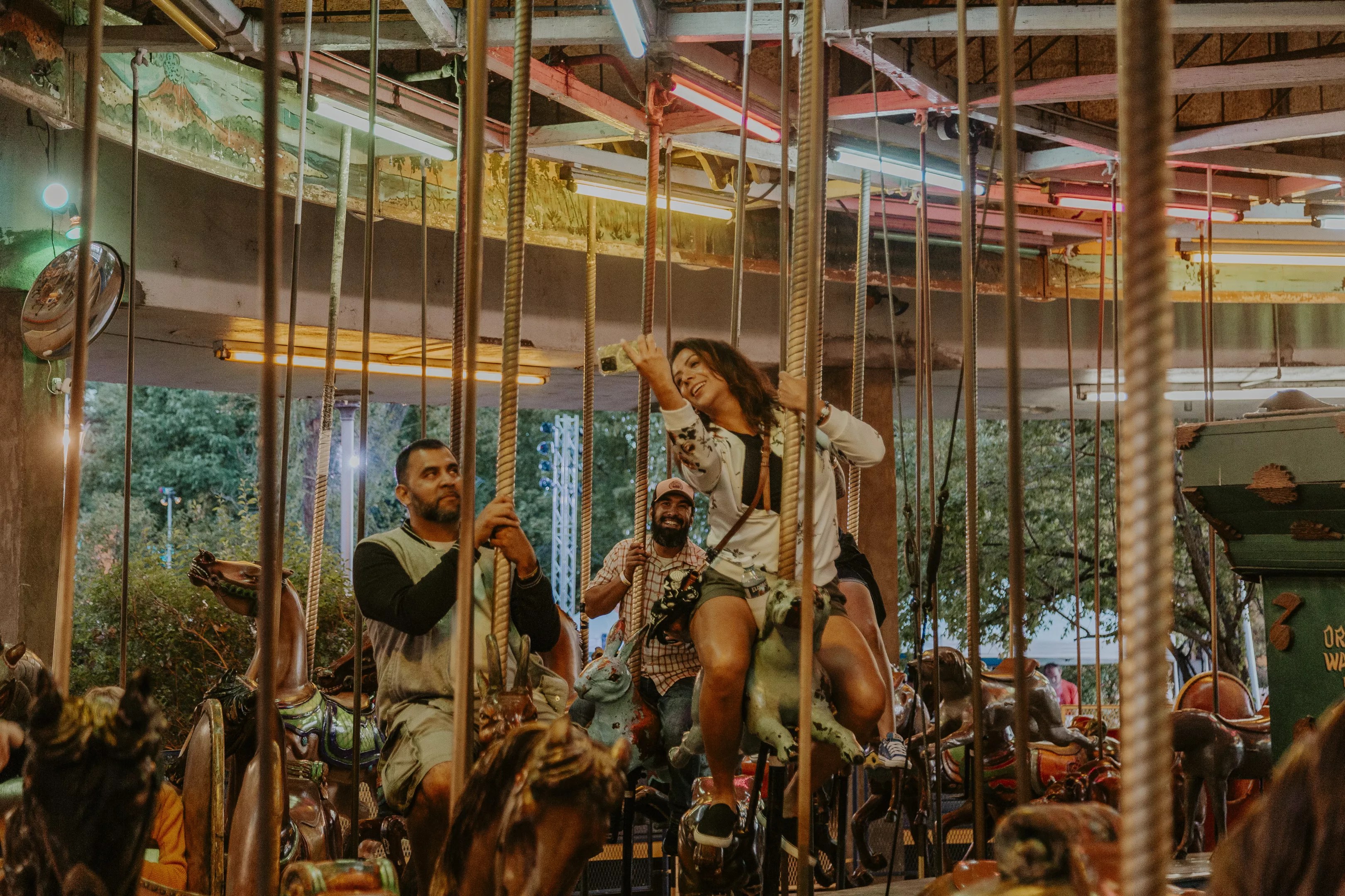 A couple takes a selfie while on the Merry Go Round at Summer Scream.