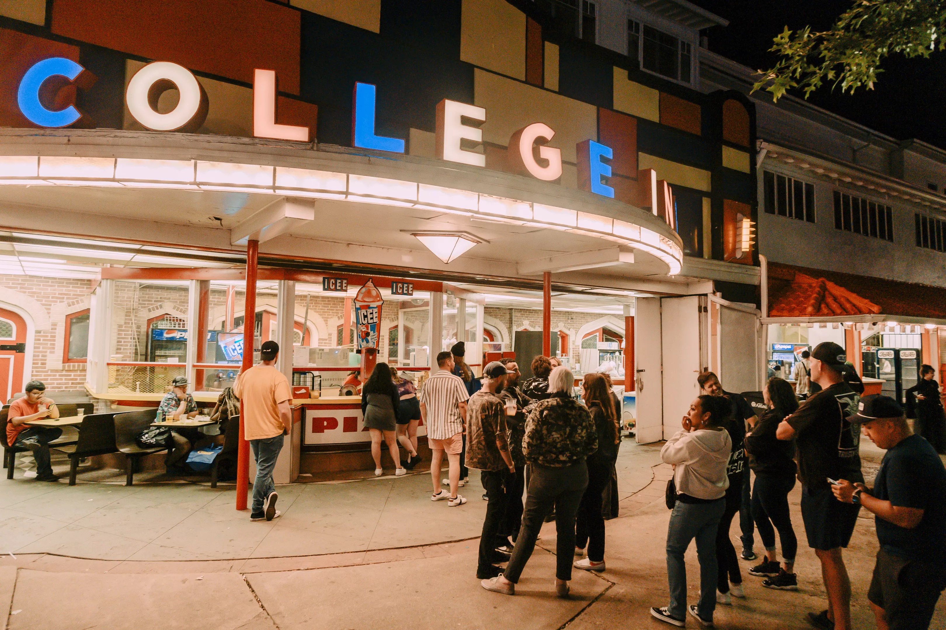 Attendees line up outside the College Inn at Lakeside Amusement Park for a snack.