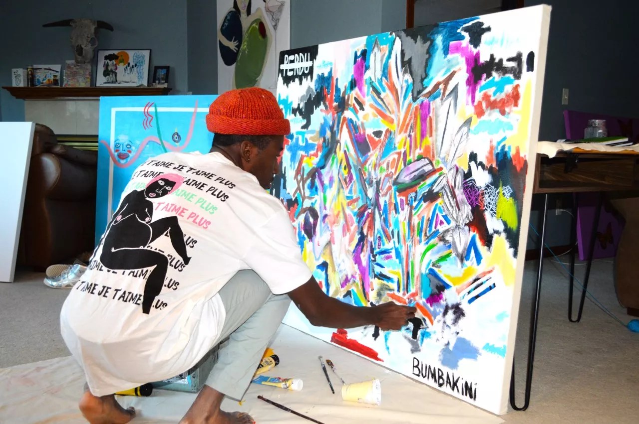 Over the past three years, Bumbakini has evolved from strictly depicting Black suffering to works that tackle themes of beauty, mortality and the many interpretations of freedom in dreamy, abstract forms. His work celebrates Black bodies and Black femininity while honoring his Central African artistic roots.