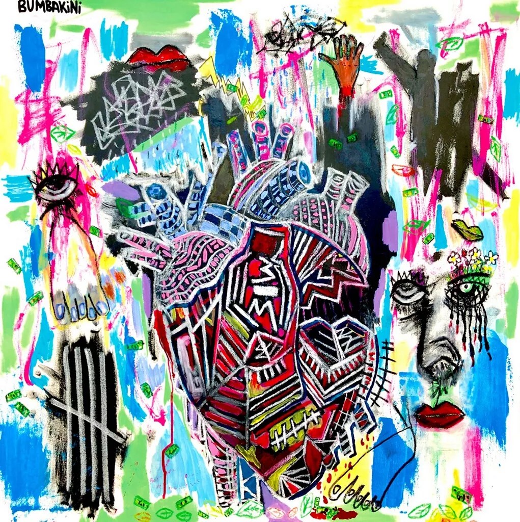 Bumbakini moved to Colorado in 2008, when his mother was offered a job in Denver, and later attended the University of Colorado Boulder, where he studied international affairs; he graduated in 2016. The self-taught artist’s body of work blends neo-expressionism and synthetic cubism; it’s not unlike the collage-style works of SAMO, the late-’70s subway graffiti collaboration between Jean-Michel Basquiat and Al Diaz that combined text and various art styles to create pithy, often political statements all around New York City.