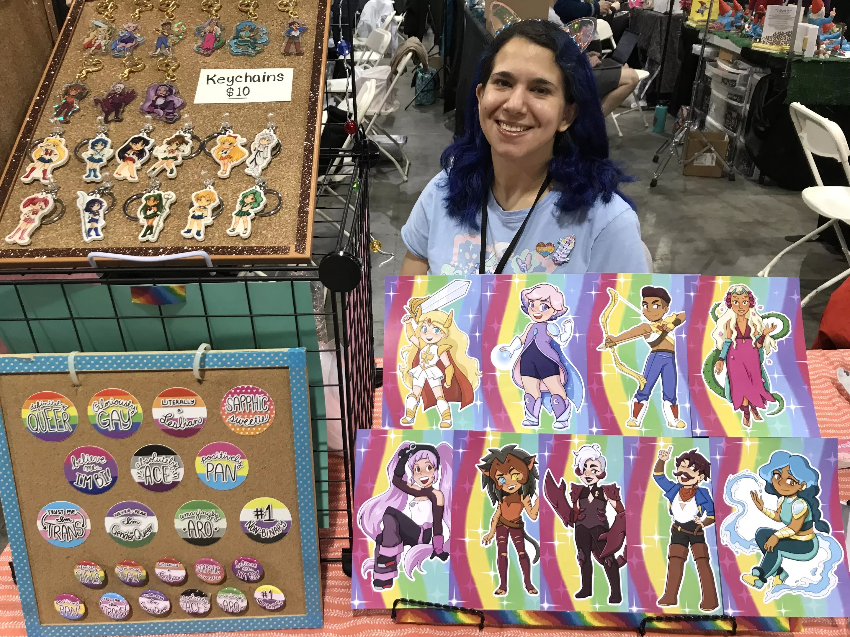 There’s a solid amount of LGBTQ+ support apparent at DPCC, from the convention patch designed to proclaim exactly that to a large portion of the art available in Artists Alley. That’s where you can find illustrator and comic artist Leanna C., offering up buttons that both support and/or proudly proclaim sexual and/or gender affiliation. Also She-Ra, which these days essentially does the same thing.
