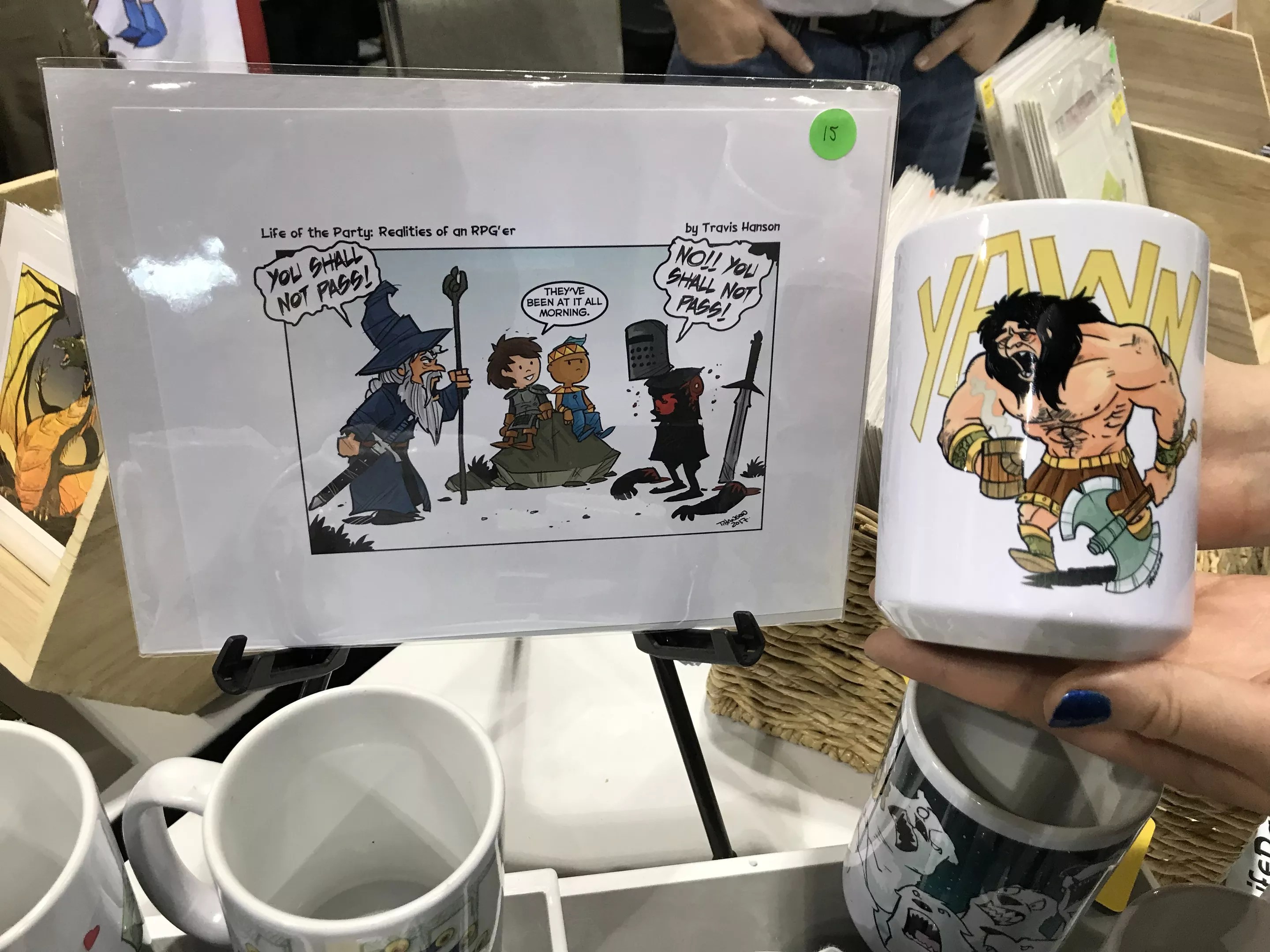 Did you know you needed a yawning barbarian on a coffee cup? You need a yawning barbarian on a coffee cup. These are the things you do not know you need until you come to Denver Pop Culture Con and visit the table of illustrator Travis Hanson. Old-school gaming and coffee? Two of everyone’s favorite things.