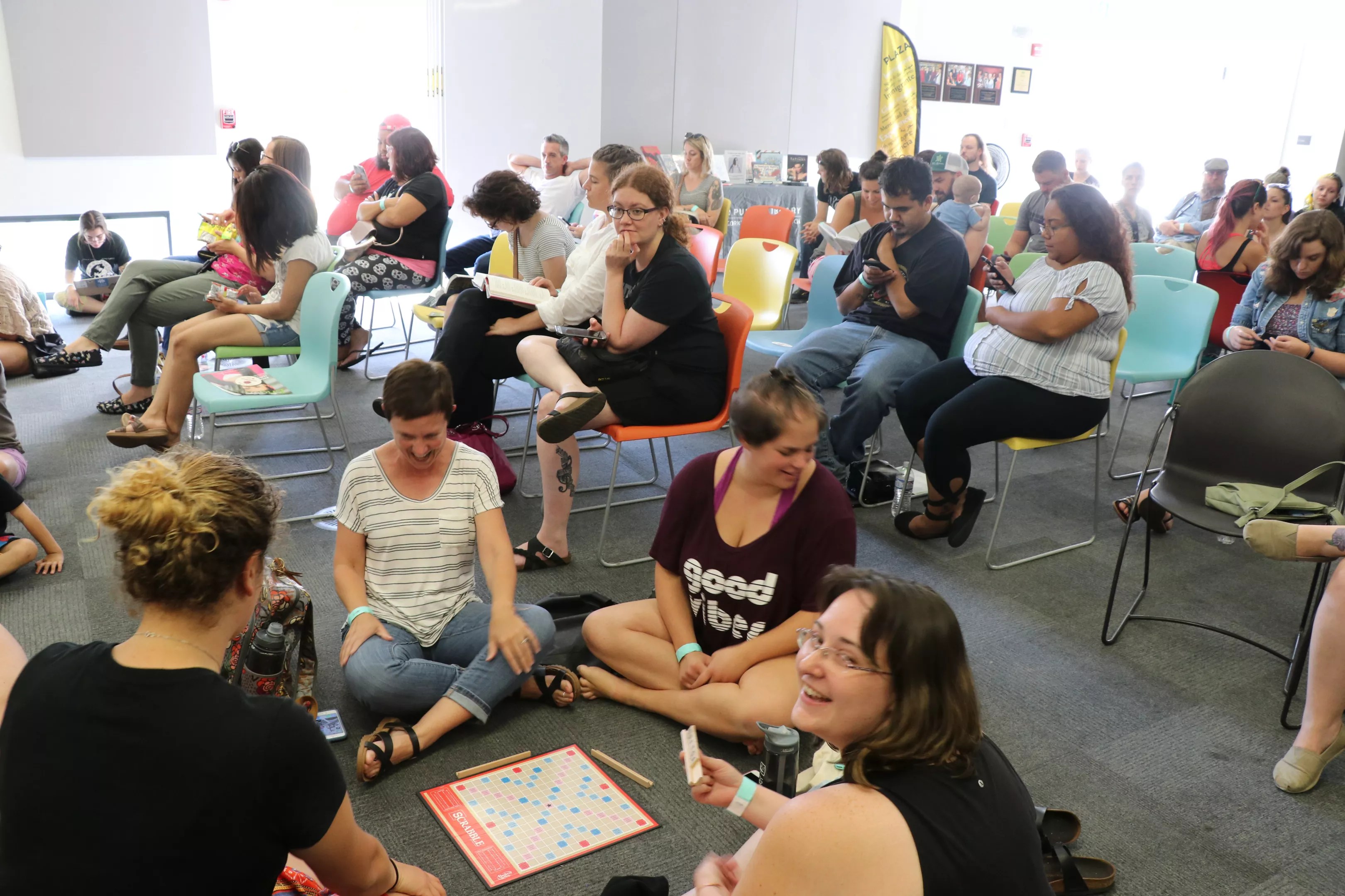The crowd in the designated waiting area wasn’t too different from a regular group of weekend library-goers; lots of people read or talked quietly with friends. In the middle of the room, a small group played a game of seemingly friendly, competitive Scrabble.
