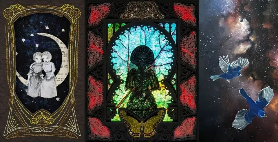 Valerie Savarie carves and alters old books into imaginative works of art; Miki Harder, a painter inspired by nature, specializes in birds; and Nicole Grosjean layers illustrations, paper, etched glass, LED lights and other mixed media in frames. In this show, they each took inspiration from specific words or concepts; as a trio, they’re well matched and inclined toward fantasy imagery.