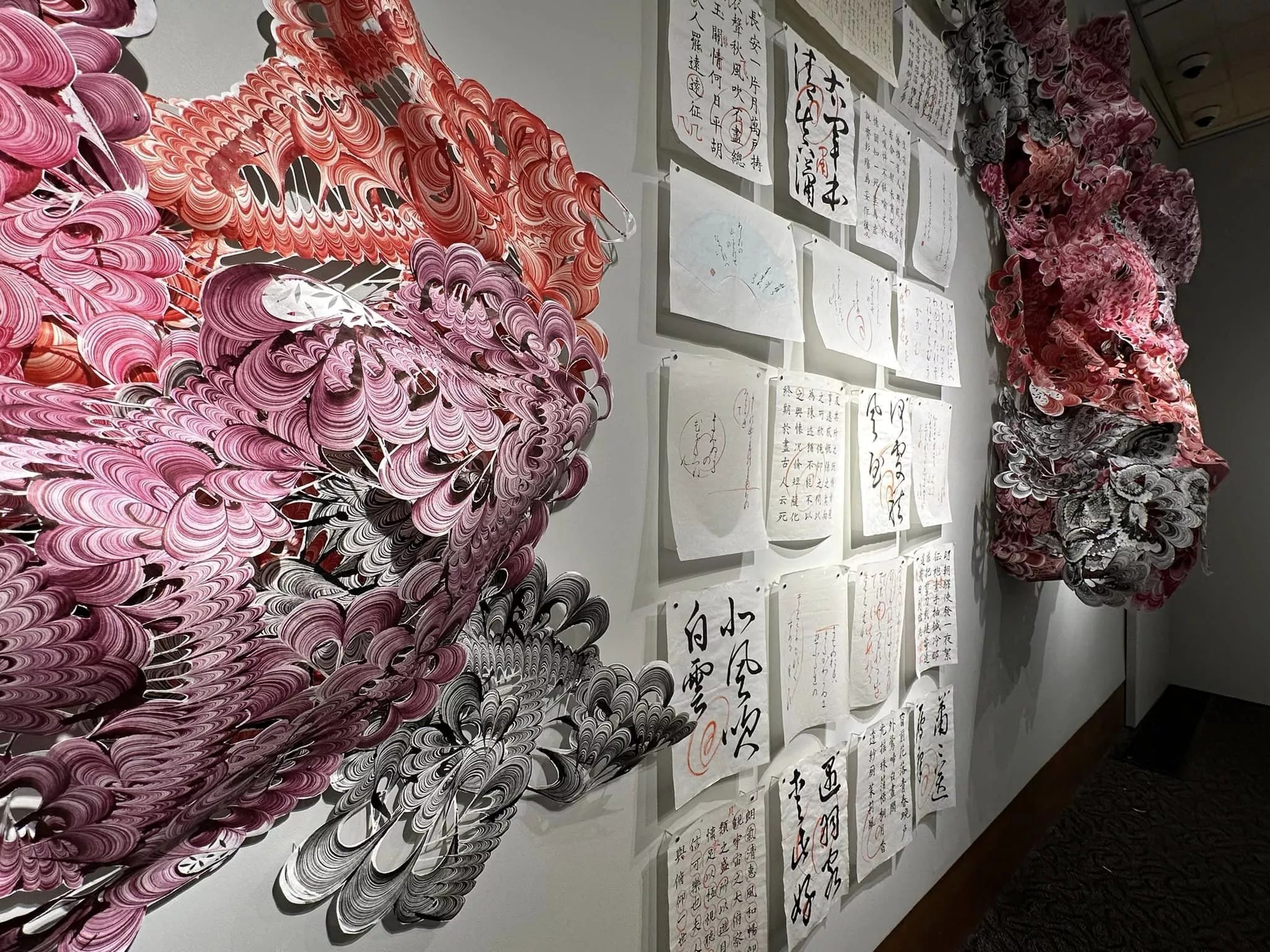 Rachel Denny, Wild and Precious Taiko Chandler, “Practice Makes Perfect,” 2023, site-specific installation: Tyvek monotype, calligraphy by the artist’s mother. Courtesy of Taiko Chandler
