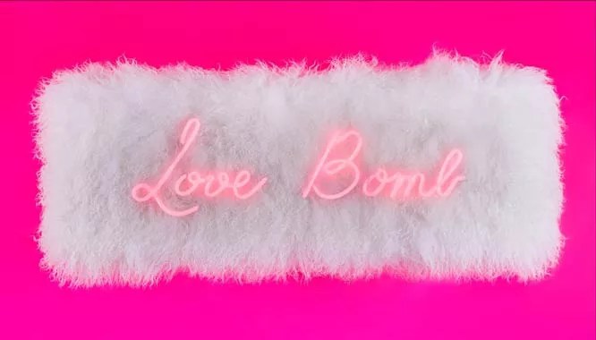“Love Bomb”, 17x46x6, Neon, Tibetan Curly Lamb, Birch and Electronics