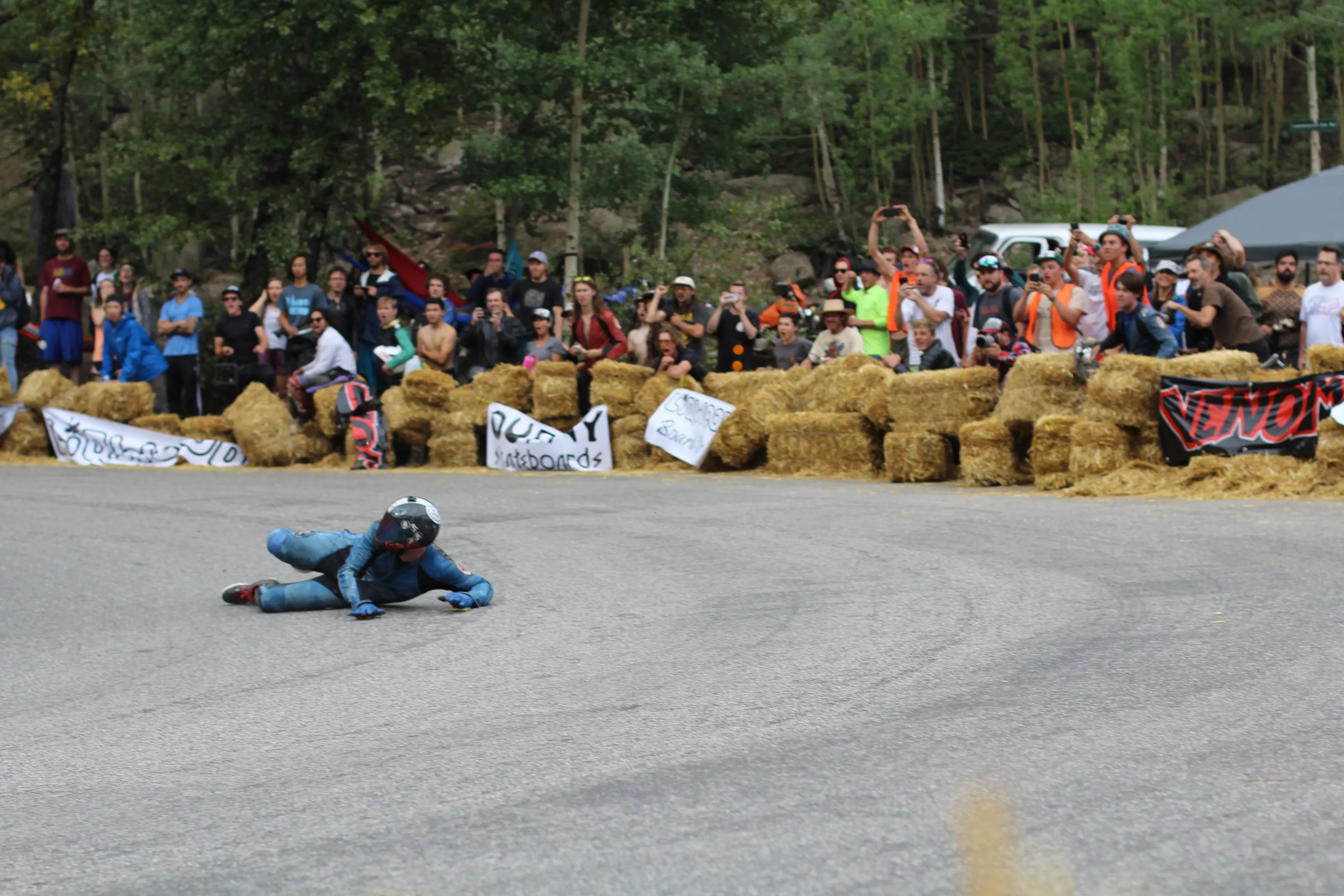 Still, no matter how well the job is done, personnel can only do so much, which is where safety gear comes into play. Full-body leather suits protect skin from the stinging bite of road rash; closed-toe shoes, a full-face helmet and a proper board configuration were also required. Nearly 1,300 bales of straw lined the course to soften crash landings and prevent riders from flying off the side of the mountain, which was not entirely outside the realm of possibility.