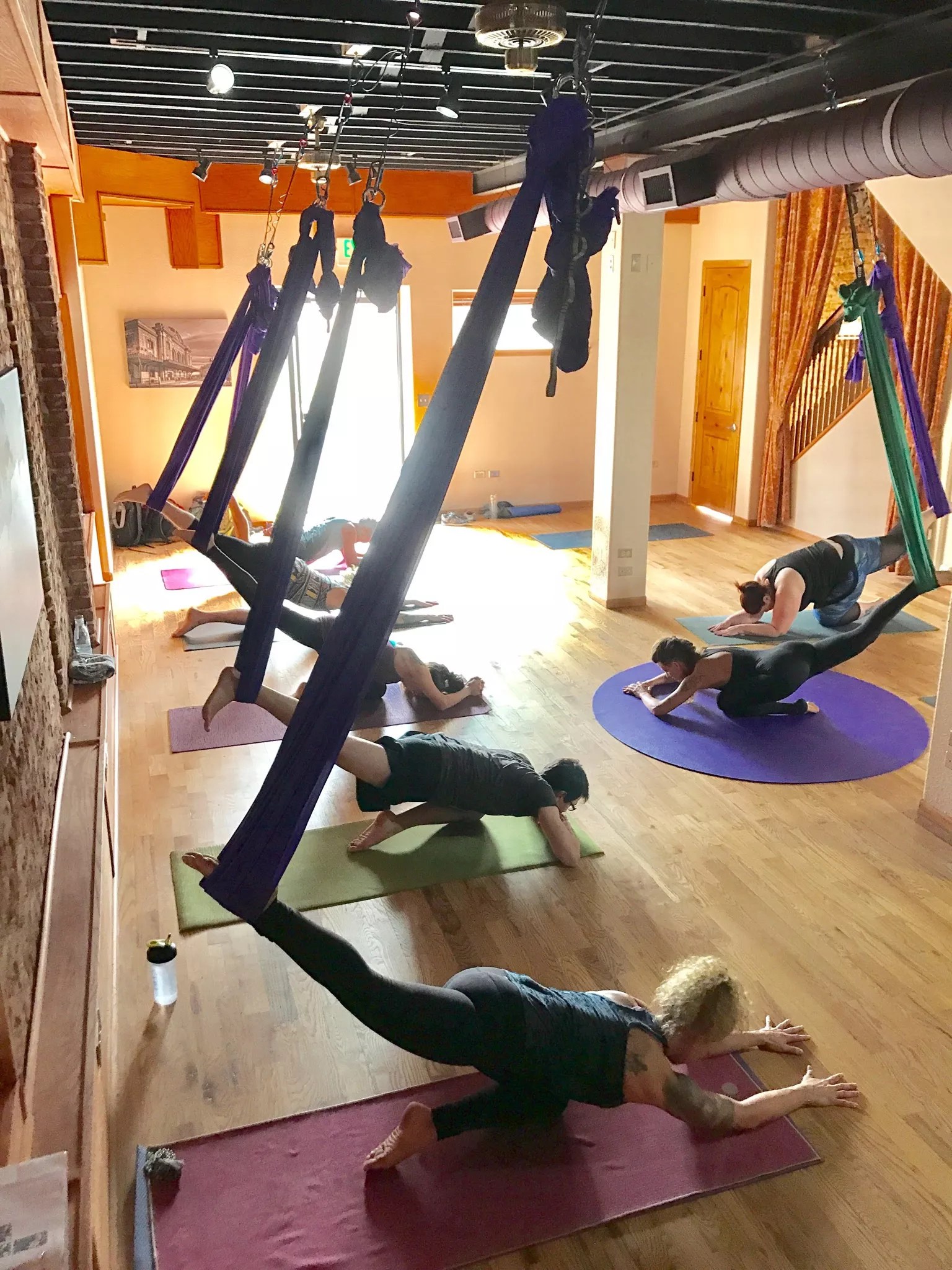 I was at a workshop in Chicago six or seven years ago. The workshop was built around circus arts, and there was looped fabric. That was my introduction to the hammocks. When I came back to Denver, I couldn’t find any aerial classes specific to yoga. There were acrobatic and circus classes here that used hammocks – but nothing based on the premise of yoga. I’m an alignment junkie, and I was looking for something that was going to change my mat practice. So I continued to develop an aerial yoga practice on my own, and then I discovered AIReal Yoga, the first and only form of aerial yoga that’s accredited by the Yoga Alliance. Aerial yoga is still pretty dang new, and as far as I know, I’m the only one doing it in Denver who is accredited.