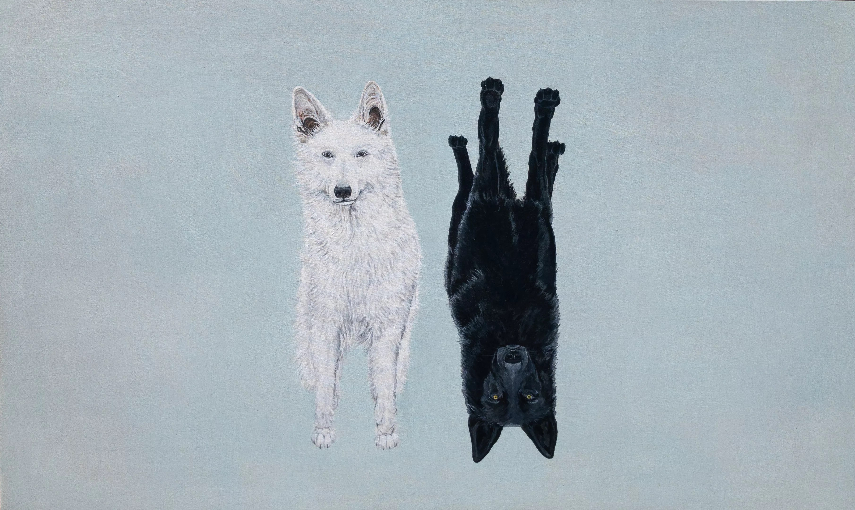 His static subjects in the exhibit include a dog, wolves, and a graffitied Confederate statue. Most of the paintings are acrylic on canvas.