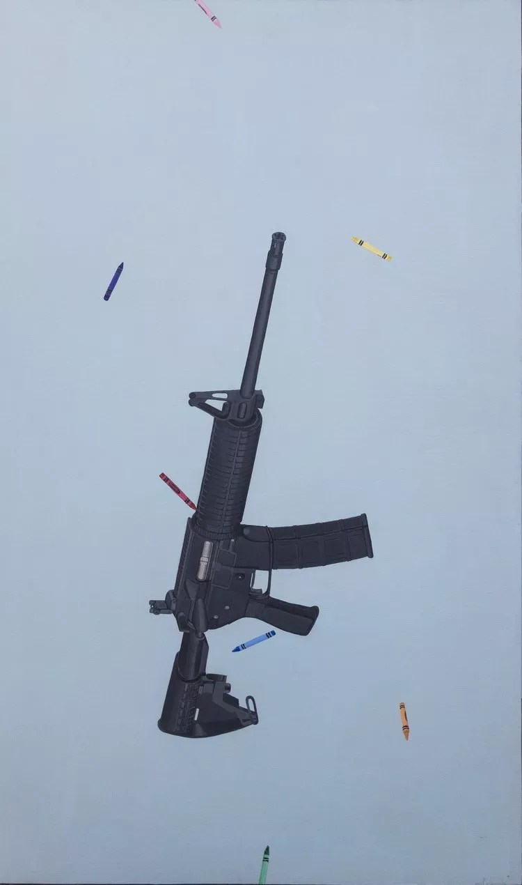 While these paintings explicitly shed light on today’s America, from an AK-47 with falling crayons around it to a newspaper vending machine with blazing newspapers, he also displays his childhood memories through his “Lucky U” paintings of a red, green, blue or purple rabbit’s foot.