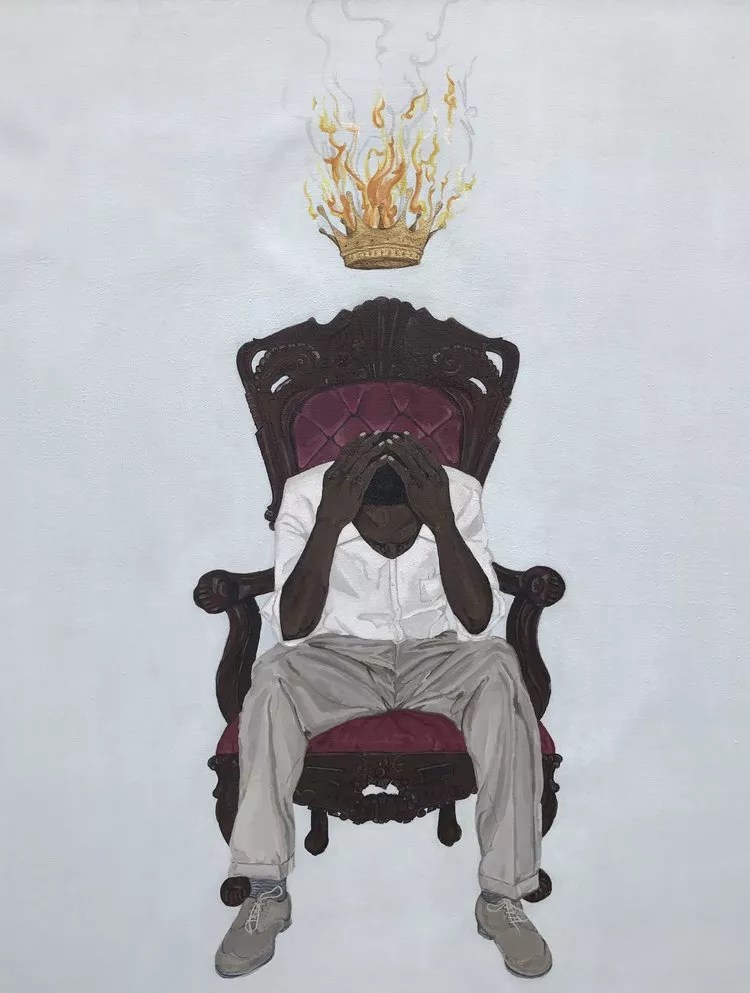 One painting in this series isolates an African-American man seated on a throne holding his head in his hands. A blazing crown hangs above the man’s head. The piece is titled “The King is Dead (11.08.2016)” and symbolizes, Chuvarsky says, the fall of the Obama administration and the portrayal of disgust, disbelief and disappointment many U.S. citizens experienced after the 2016 election.