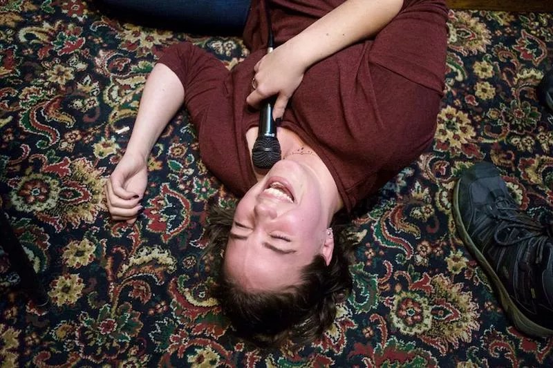 We Still Like You host Rachel Weeks, getting acquainted with dive-bar carpeting.