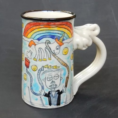 Tom Edwards wants to clear the air with Elon Musk. The Evergreen potter says it’s been over a year since the multi-billionaire genius behind Tesla first lifted one of his most popular designs: a whimsical drawing of a unicorn passing rainbow-colored gas into a tube that seemingly powers a small electric car.