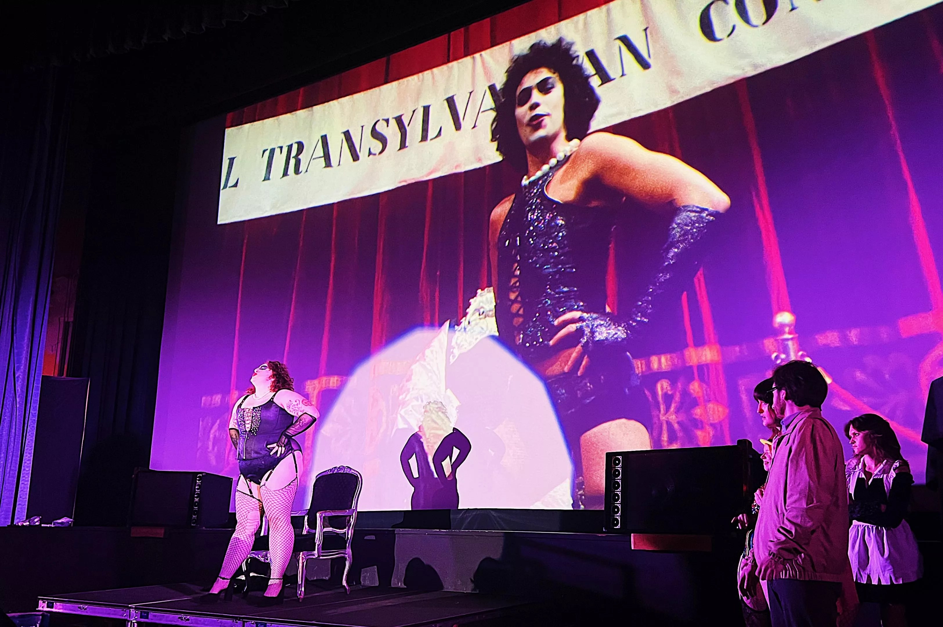 Since 2000, the shadow cast has acted out the movie as it plays on screen – and the experience is just as interactive for audience members. Attendees on Saturday were given props to use during the show, including maracas, party hats, toilet paper to throw and condoms, just because. In between sing-along musical numbers, the cast and crowd danced, clapped and shouted jokes, setting up the film’s dialogue to serve as punchlines. (“Describe the death of the Esquire,” one person yelled before the movie character Frank said, “It was a mercy killing.” The audience booed.)