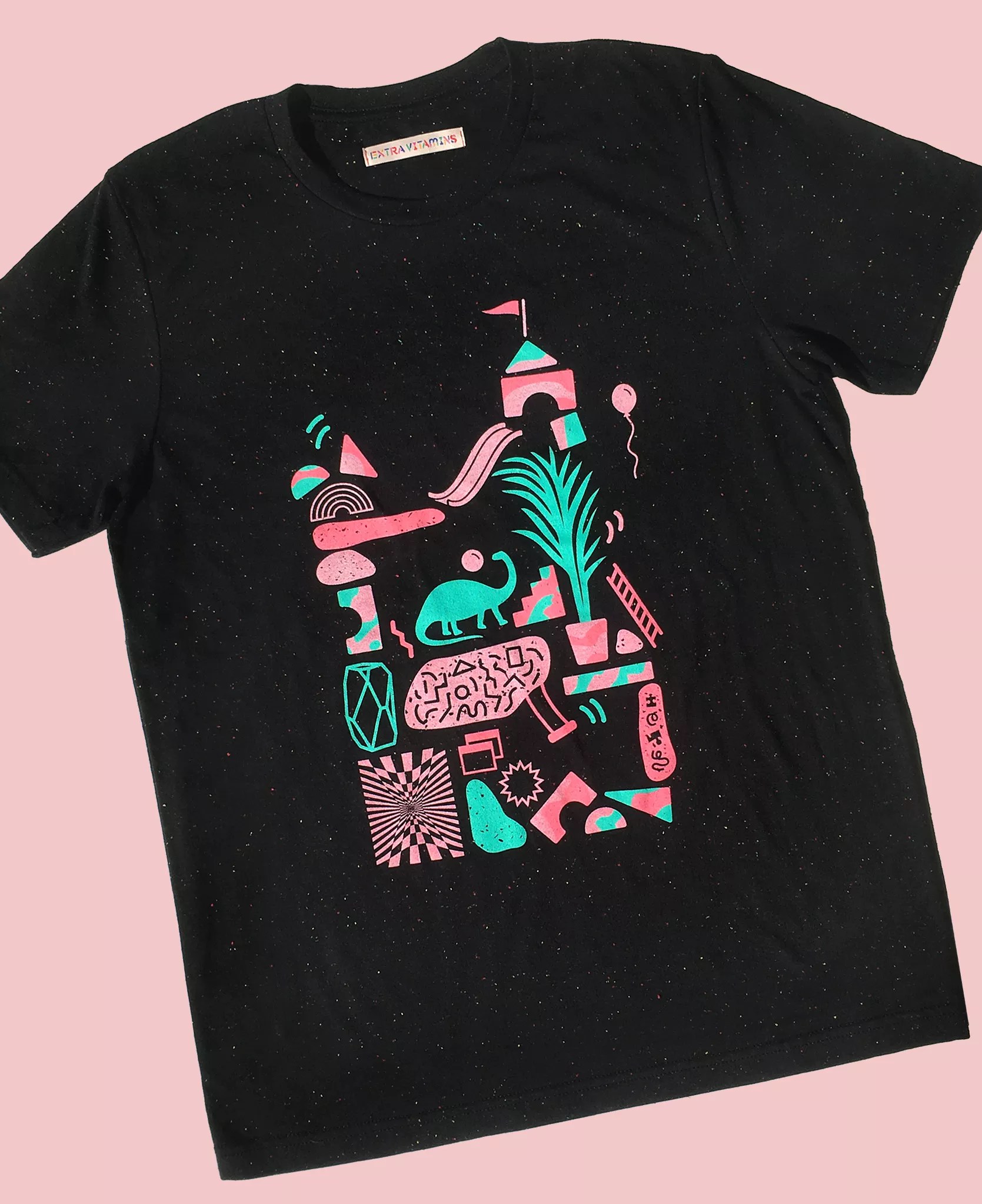 That practice expands on the original idea of zine-making, with a line of hip and affordable art products, from T-shirts to enamel pins. The pair first popped up in earnest as Extra Vitamins last fall for “Feel Days,” a month-long residency at Dateline Gallery during which they built a play-inspired installation and sold merchandise.