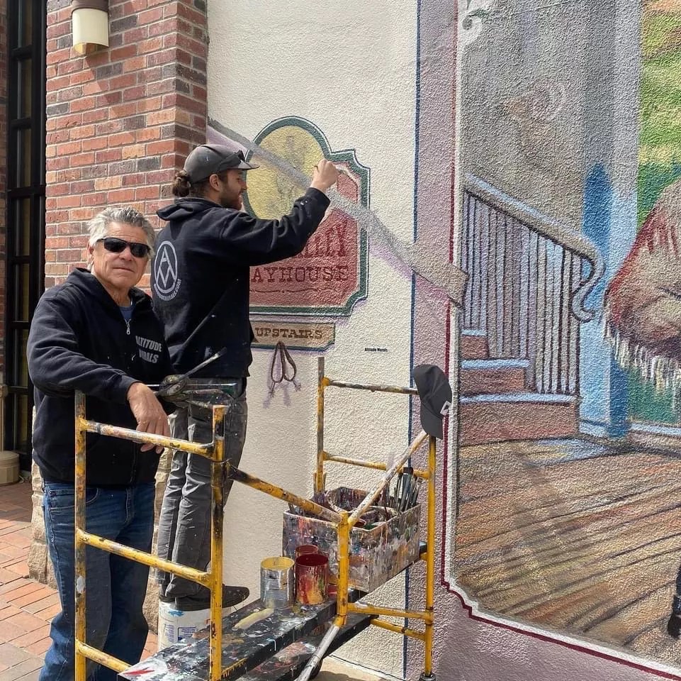 Will Krieg (right) repainting one of Chris Krieg’s (left) original murals in Golden, CO.