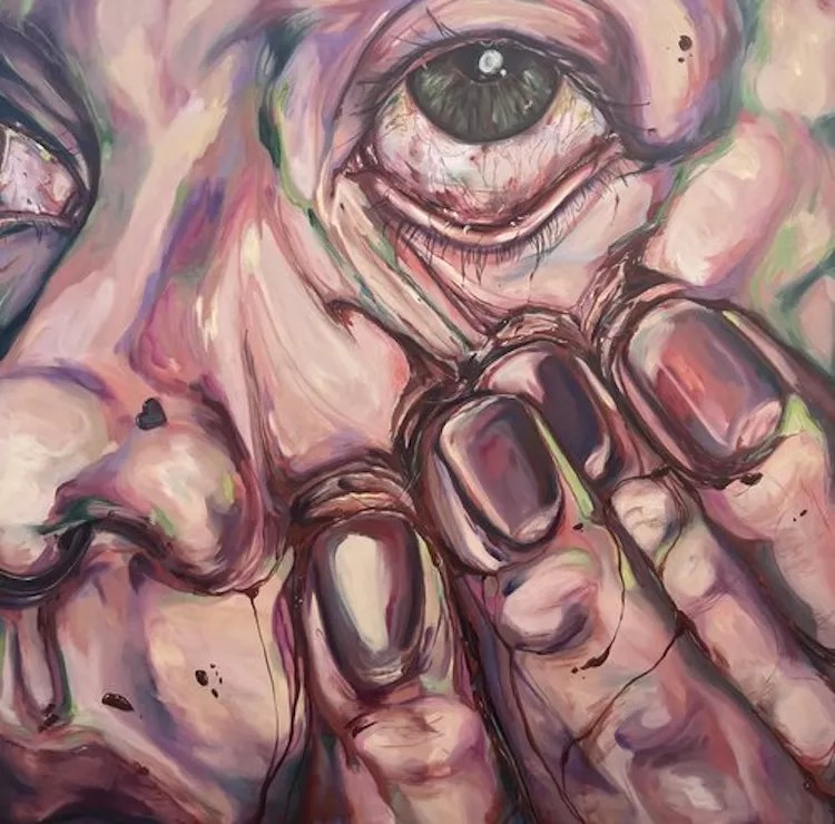 Madi Brunetti’s like an open wound addresses the artist’s history of self-cutting that began when she was a bullied twelve-year-old, driven by self-hatred that erupted when it became too much to bear. Like the subject, it’s not pretty, but don’t turn away: Her paintings demonstrate the hardwired need to self-harm on a never-ending cycle. And besides being an oil painter, the talented young artist also works with mixed media and embroidery, portraying lighter subjects from the insect and garden worlds.