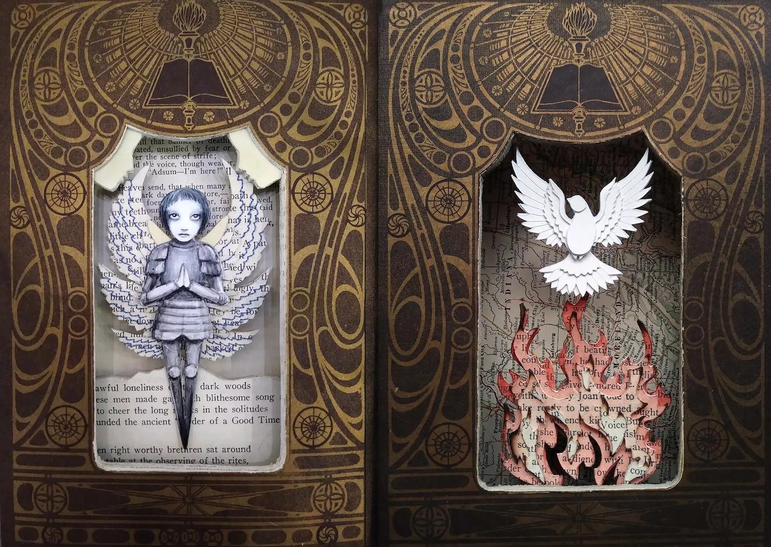 Altered-book artist Valerie Savarie begins with a book and ends up with a three-dimensional sculpture by cutting, pasting, sewing and carving the pages within, resulting in charming, layered book dioramas. Savarie takes a break from her Lakewood studio/gallery space Valkarie for a solo at Balefire in Olde Town Arvada.