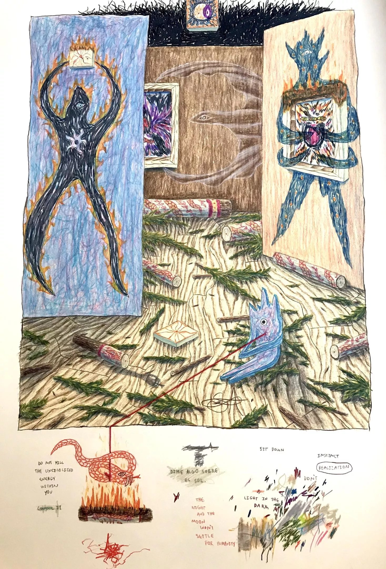 The New York-based artist couple Esteban Cabeza de Baca and Heidi Howard team up at David B. Smith Gallery for Night & Day Dreams, a dual exhibition of individual and collaborative works channeling inner mysticism and human connections relating to the unspoiled natural world. Interspersed throughout their imagery lie fleeting personal references to the creep of colonialism and living with non-normative personalities. Whether created in unison or apart, the works in this show integrate the flow between partners in lovely ways.