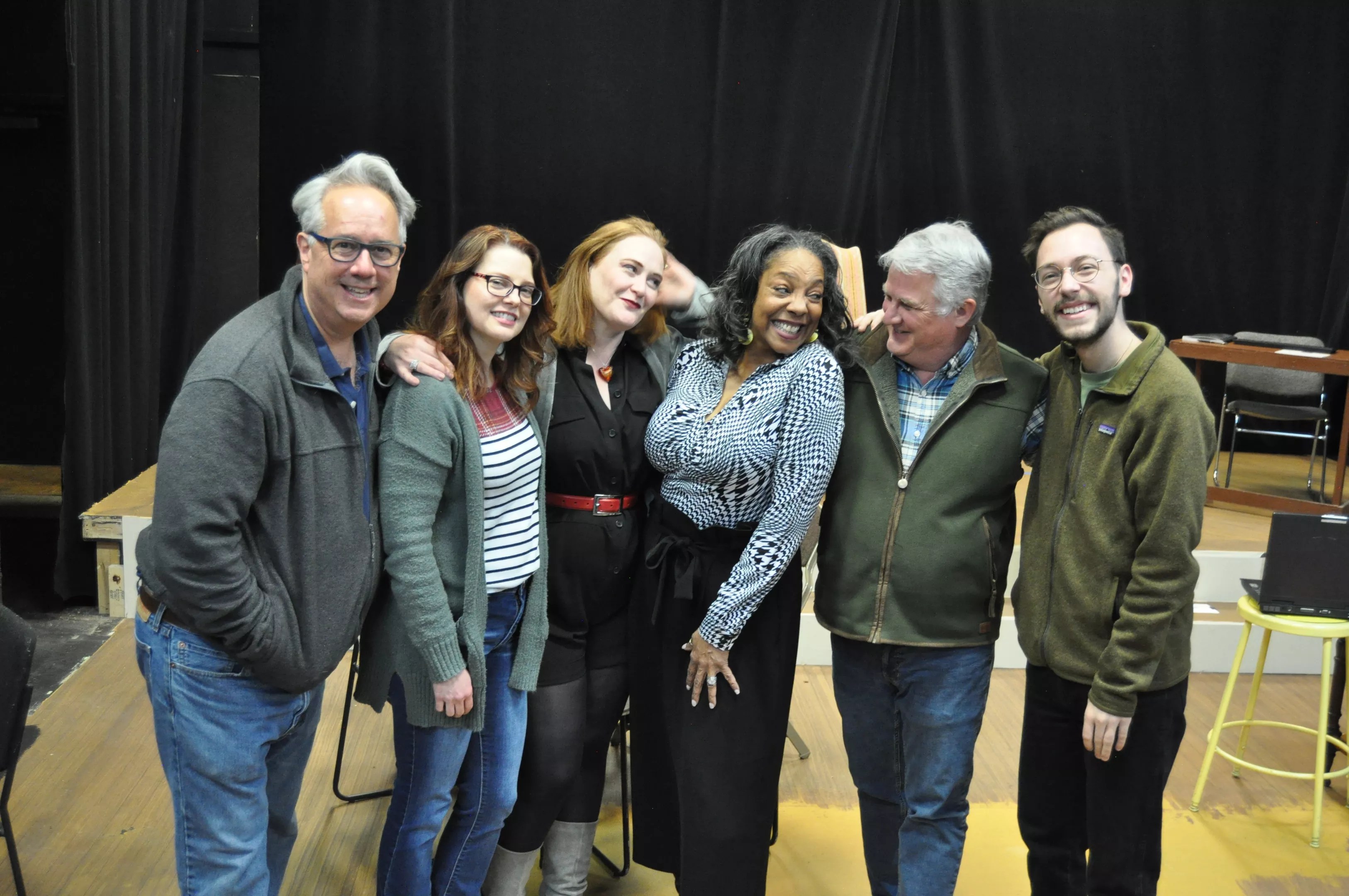 The director and cast (from left to right: Peter J. Hughes, Lisa Kraai, Kelly Uhlenhopp, Adrienne Martin-Fullwood, Matt Hindmarch and Joey Torrison) of Firehouse Theater Company's production of Tiny Beautiful Things.