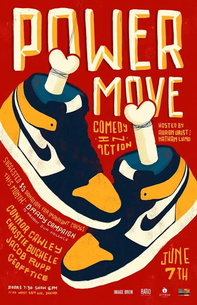A consistently well-curated standup showcase with a philanthropic mission statement, Power Move: Comedy in Action enlists some of Denver’s funniest people in an effort to raise funds for a myriad of worthy causes. Co-created by local funsters Nathan Lund and Aaron Urist, Power Move offers an evening of laughs, plus free brews from Ratio Beerworks and Stem Ciders in exchange for a suggested $5 donation toward the benefit of a different charity each month, an honorable tradition that continues with June’s organization, the Brady Campaign to Prevent Gun Violence. Join Lund and Urist along with guest comedians Jacob Rupp, Geoff Tice, Christie Buchele and Connor Cawley.