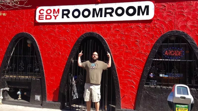 Light the Lights El Charrito proprietor Matt Orrin standing proudly before the Comedy RoomRoom. Left Hand Right Brain