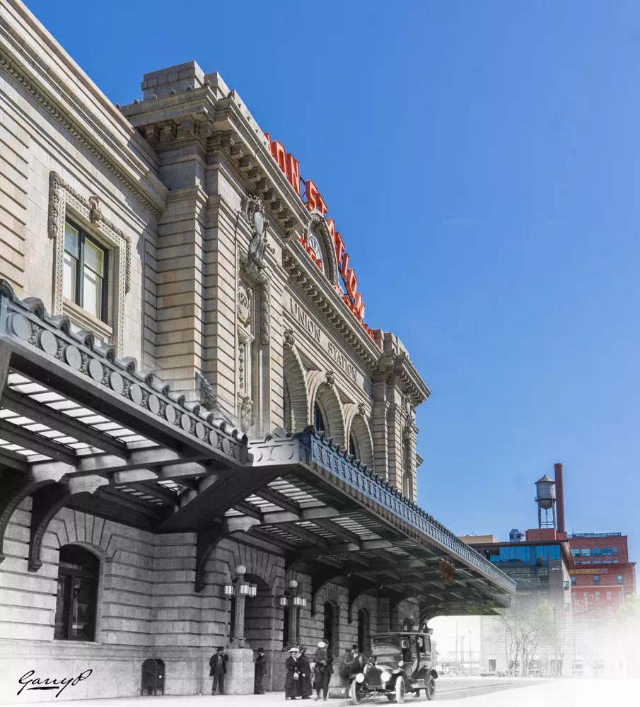 The Union Station terminal building has served Denver since 1914, as seen in this blend of old and new photos.