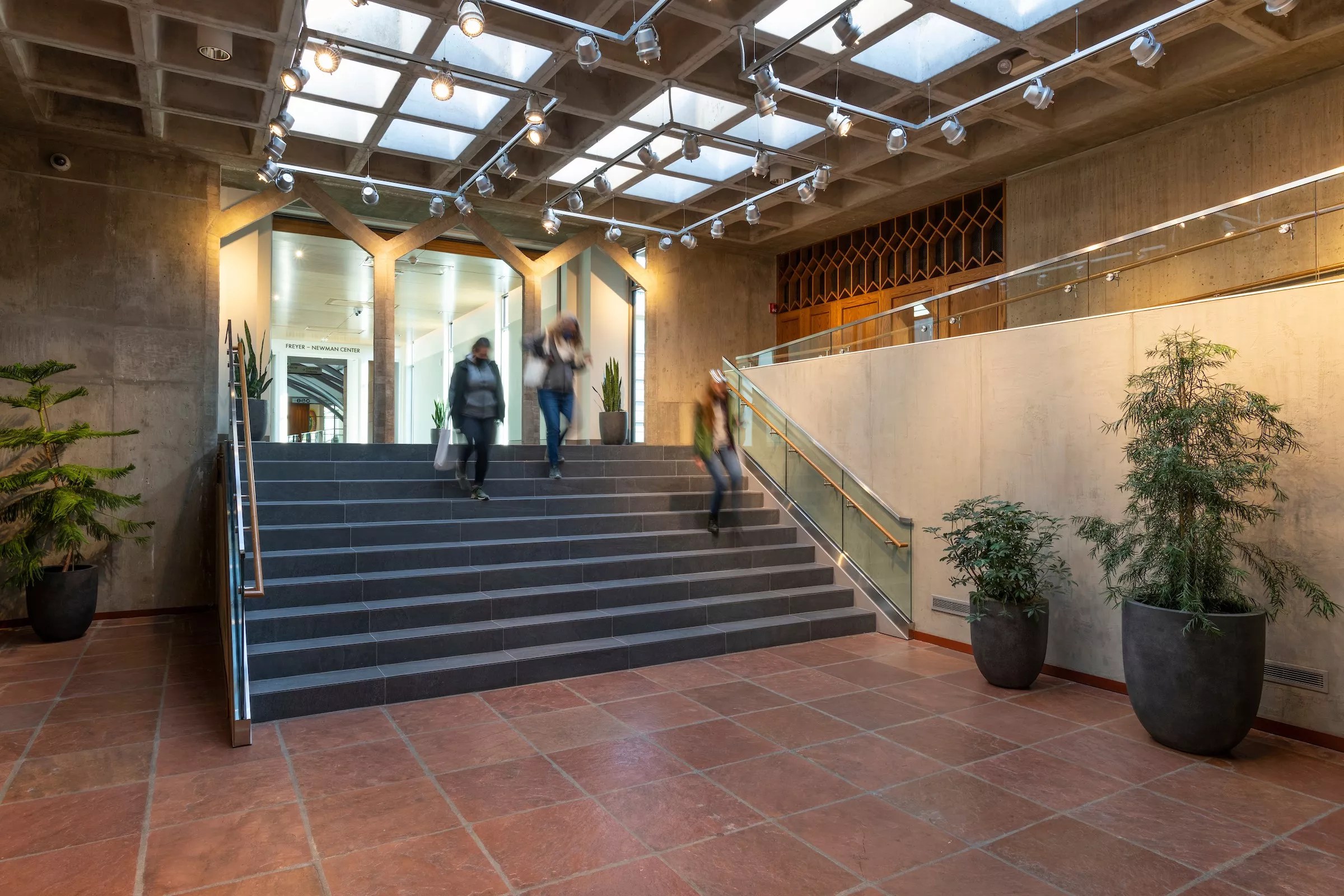 The most obvious Hornbein-inspired elements to be employed in Daniel’s Freyer-Newman Center are the simplified tree shapes used as structural supports in front of the entrance and in the atrium, along with the juxtaposition of cast concrete to red limestone in the masonry walls. However, Daniel’s extensive use of glass curtain walls, divided into strictly horizontal/vertical grids, is a distinct departure from the existing Hornbein details.