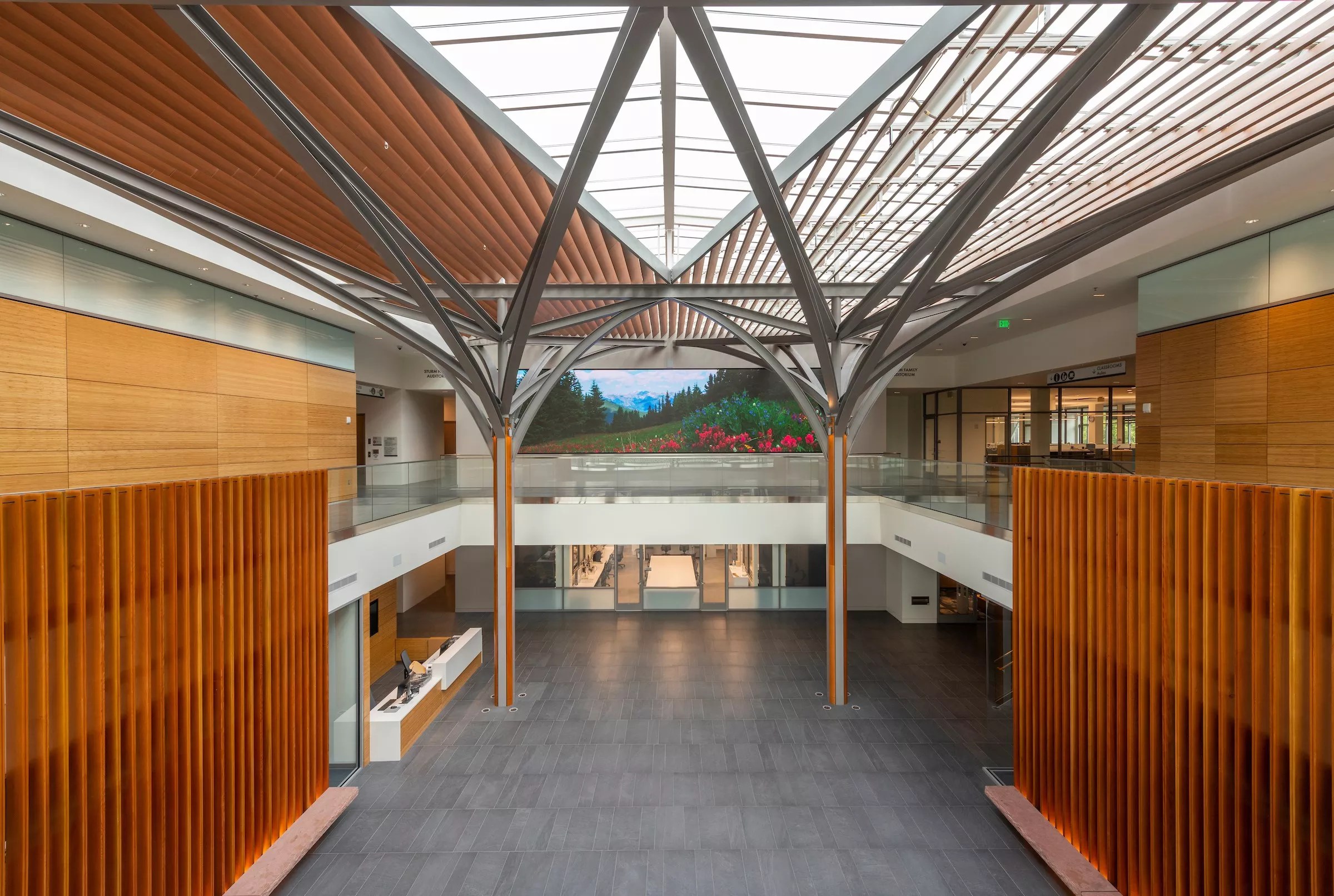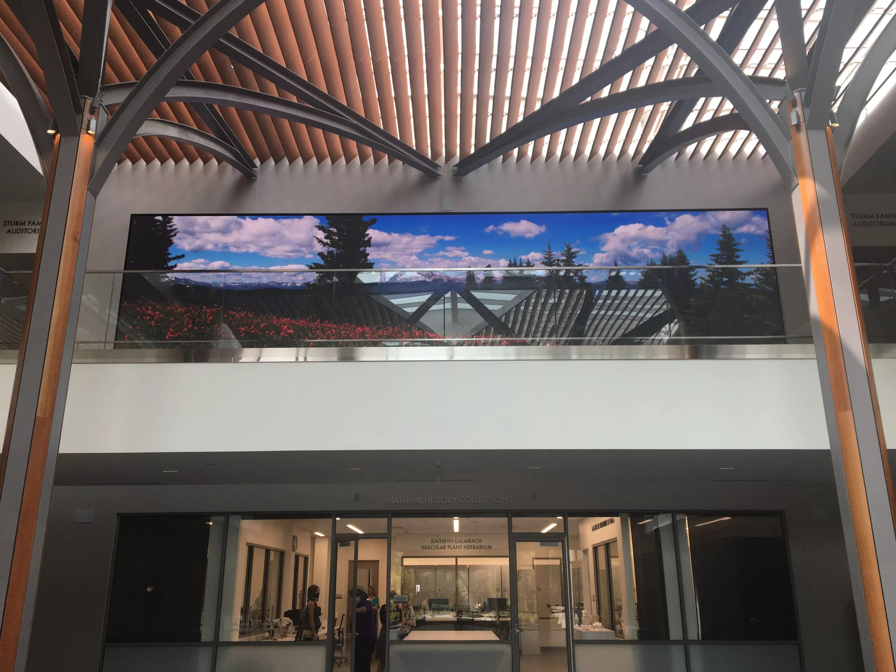 The ten-foot-by-forty-foot LED video panel on the floor above the glass wall of the laboratories in the atrium.