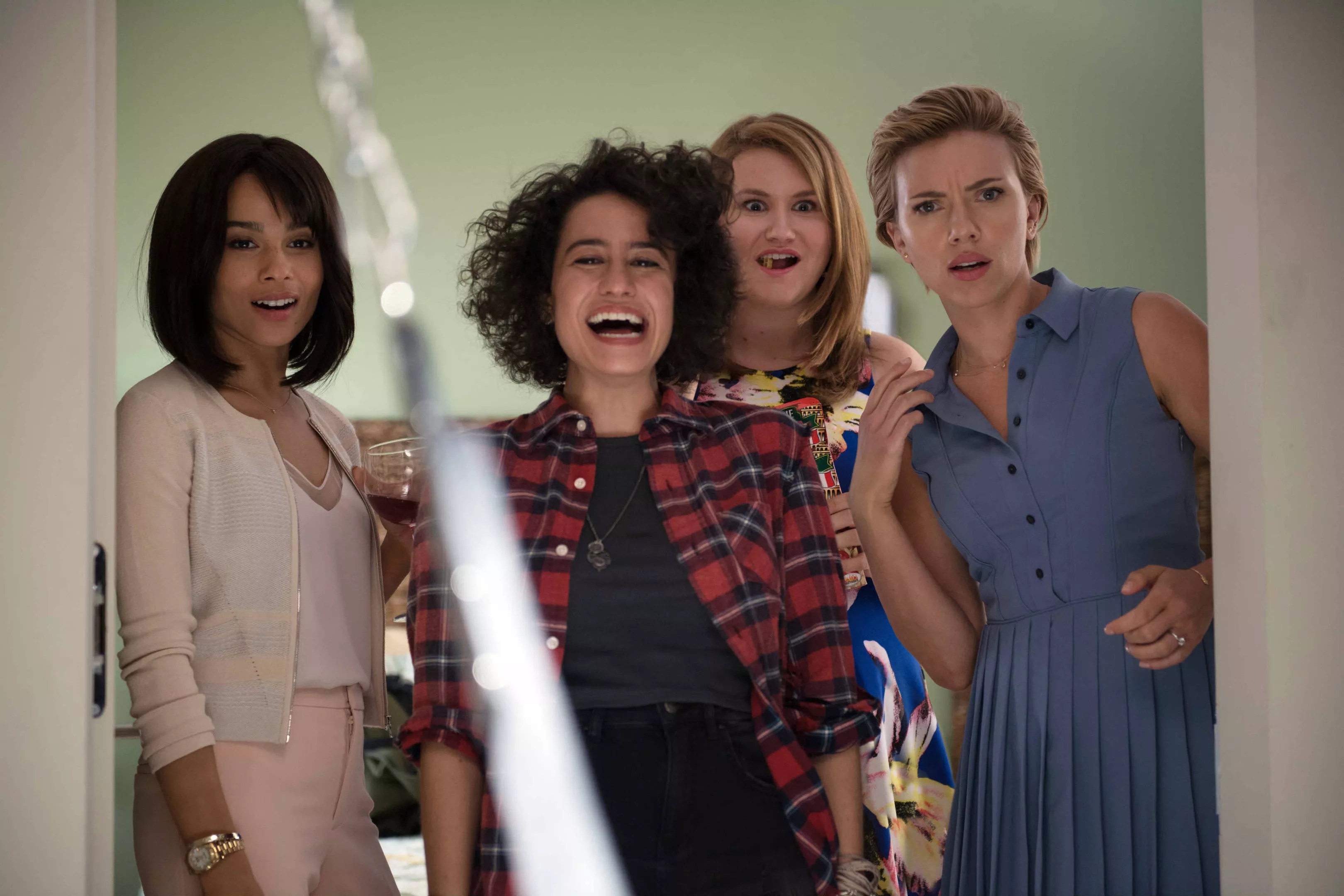 The performers are excellent and they score some laughs, but their roles here amount to “the jealous friend” and “the progressive activist.” The Australian pal (Kate McKinnon), arrived in America for the first time, whips out the Vegemite in her first minute of screen time and then immediately is called a “Kiwi” by the jealous pal, Alice (Jillian Bell), who taps her cocktail glass with her cutlery to announce a celebratory toast the moment anyone else tries to speak to the bride to be, Scarlett Johansson’s Jess. ZoÁ« Kravitz and Ilana Glazer play one-time lovers who, after this group’s college heyday, went down their separate schematic paths, one upper-crust and the other crusty hippie. The question isn’t whether, by the end, Kravitz’s Blair, living the Ivanka life of thread counts and high-end real estate, and Glazer’s Frankie, introduced yelling through a bullhorn at a Brooklyn protest, will have fallen for each other all over again. It’s whether the movie will relent in its hurlyburly long enough to allow these two even a moment of connection on the way.