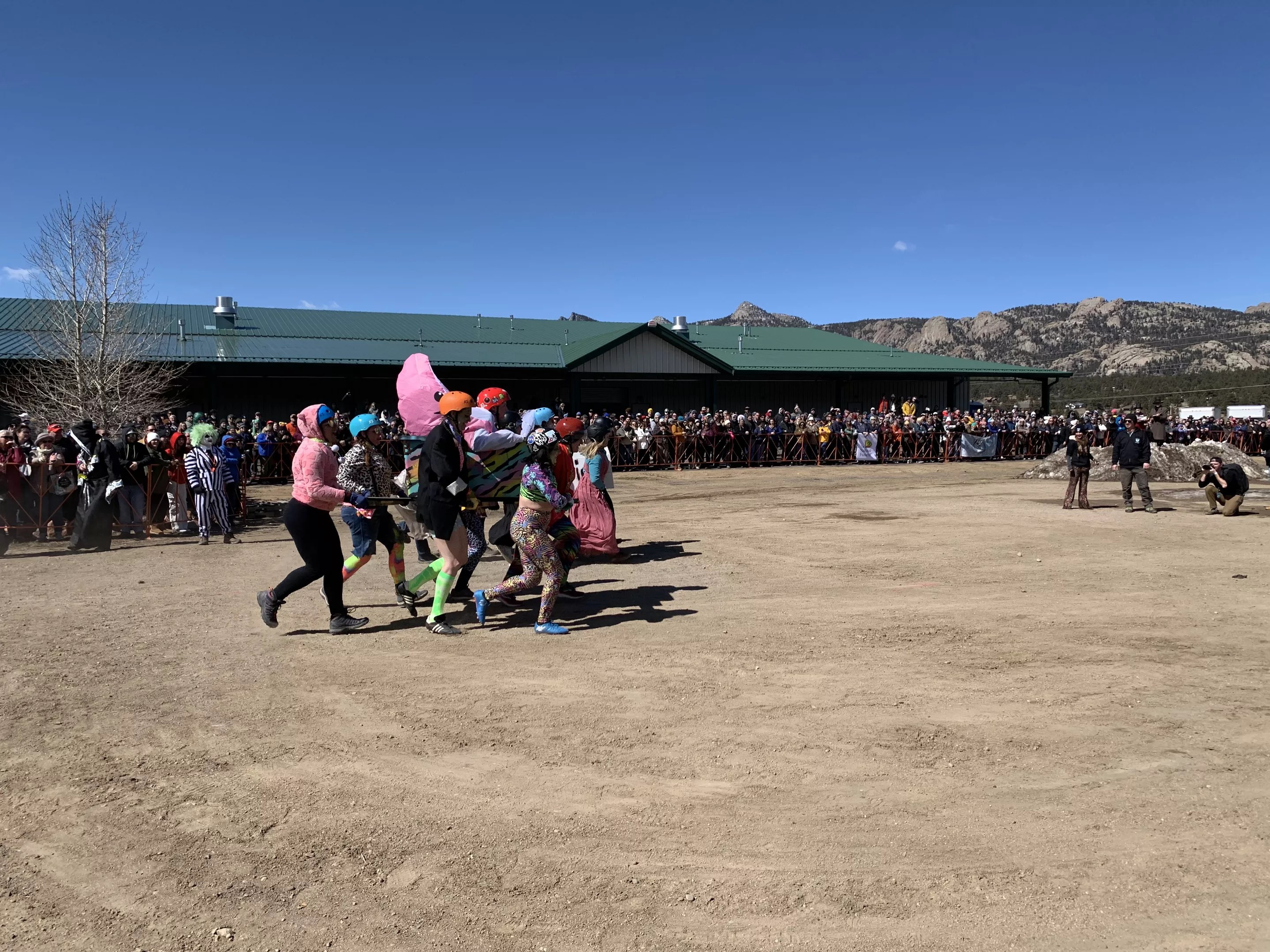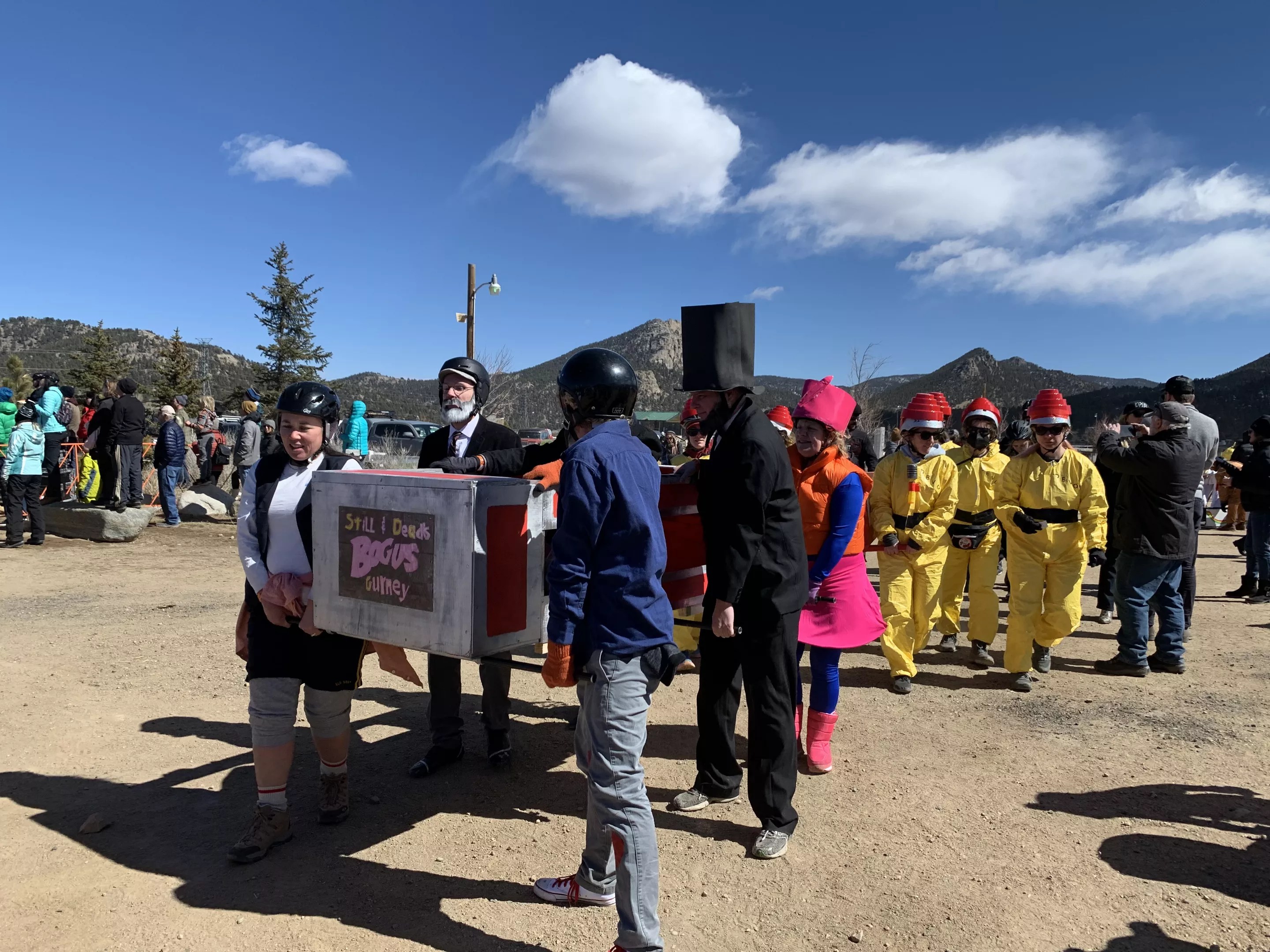 And Hedgepeth would know – he’s been the emcee for the FDGD coffin races for the better part of a decade, and was able to return to that role in Estes Park, along with another longtime emcee, Stephanie Andelman. The coffin races were definitely the star attraction of the festival, with many participants saying that was what they came for. The organizers devoted a large section at the entrance to the coffin race obstacle course, which included a hill for the “corpses” to run up, limbo sticks and a required switcheroo of pallbearers. The atmosphere was less intense competition and more “How ridiculous is this?” The emcees for the event kept up a constant commentary, often heckling and lightheartedly teasing the participants. In one memorable moment, when the “Best in Snow” team’s coffin disintegrated and broke into pieces before it even hit the first obstacle, Hedgepeth joked that the group was being “put down” by its competitors. As a consolation prize, the team ultimately won the prize for “Most Notable Wipeout,” which came with free beer.