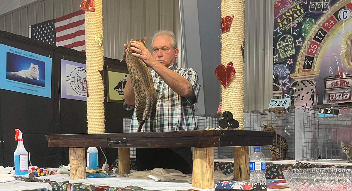 TICA judge Jim Armel inspects Savannah at Kitty Prom 2022.