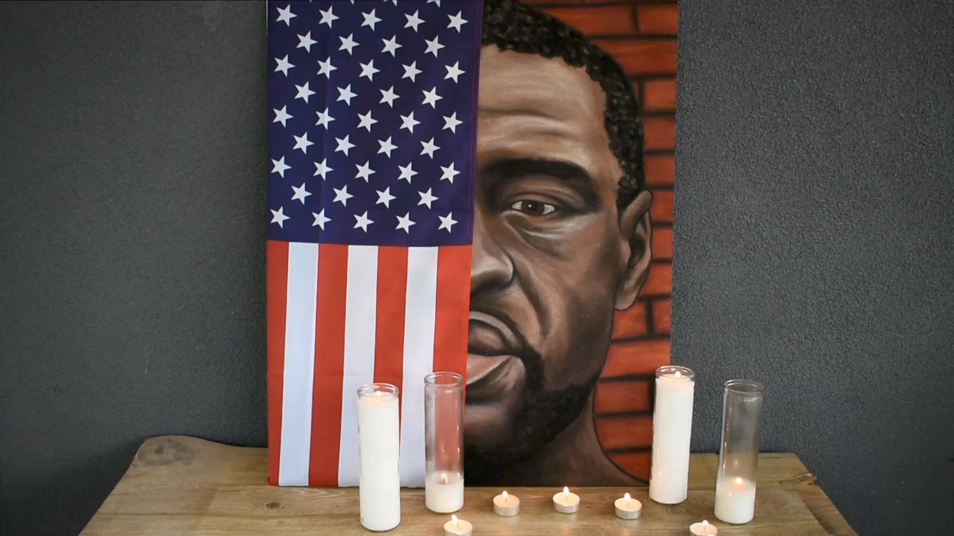 Throughout the video, she tries various visual strategies to elicit empathy – from draping the portrait of Floyd with a flag to donning a white mask. She repeats the question, “Can you see me now?”