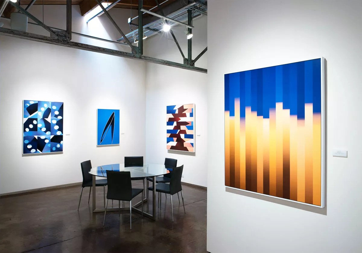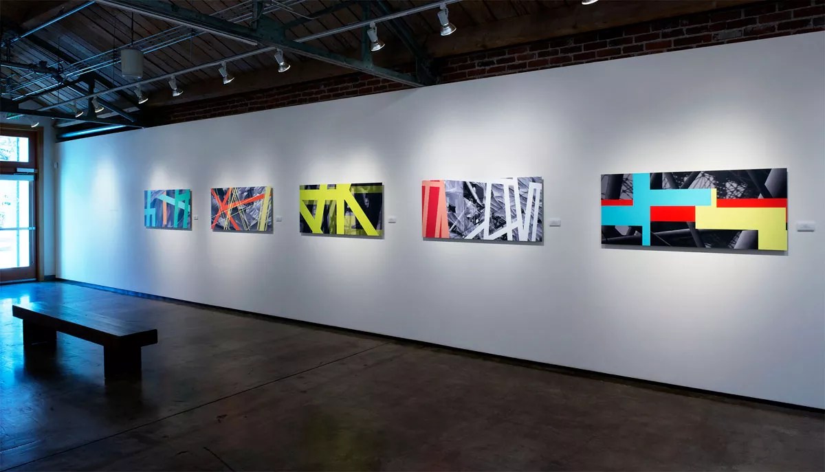 A shared taste for strong compositions links Biondo’s work to that of Alpert + Kahn, a Westcliffe-based partnership of artists Renee Alpert and Douglas Kahn; the couple is also interested in conjuring abstracts from actual scenes. Alpert + Kahn took photos of construction sites, choosing buildings in skeletal form or those that have been draped in plastic sheeting. Printed in black and white, they became the backgrounds, receding with their inherent perspective. Then, at imaginary levels both at and behind the picture plane, the pair digitally introduced broad linear constructions done in bright colors laid over the background photos. Installation view, Brenda Biondo: Paper Skies. Sunshine Divis