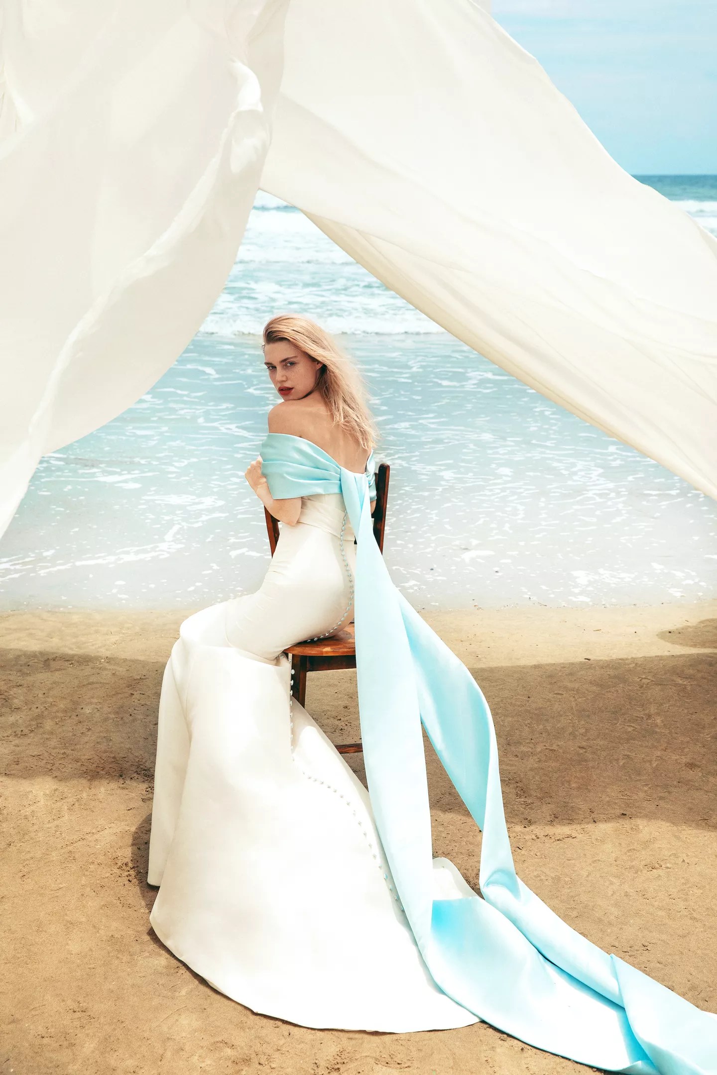 When he graduated from FIT in 2017, Pharis was working for the luxury women’s wear company SemSem. The following year, he left to develop his own collections. He knew he wanted to return to his first love: bridal fashion and evening gowns.