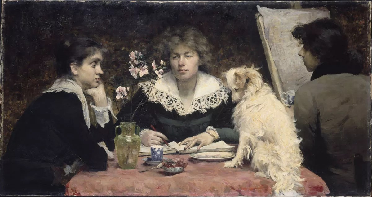 As indicated by the prominent placement of the Bashkirtseff, the show’s subtitle – “Women Artists in the Age of Impressionism” – is misleading, but intentionally so. Some of the artists are impressionists, but most are not; the show includes not only academic painters such as Bashkirtseff, but realists and others. The word “impressionism” has a lot of cachet with the art-viewing public, however, and that misdirection clearly works, since the show has attracted a throng of visitors. “The Friends (Les amies),” by Louise-Catherine Breslau, oil on canvas. Courtesy American Federation of Arts