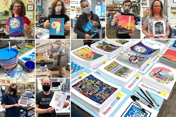 The exhibit, called Hope.HOME!, includes prints from more than 25 artists. There will be 100 copies of each, each selling for $30. The show includes works by Javier Flores, Dave Pendleton, John Fellows, Joe Flores, Alden and others.