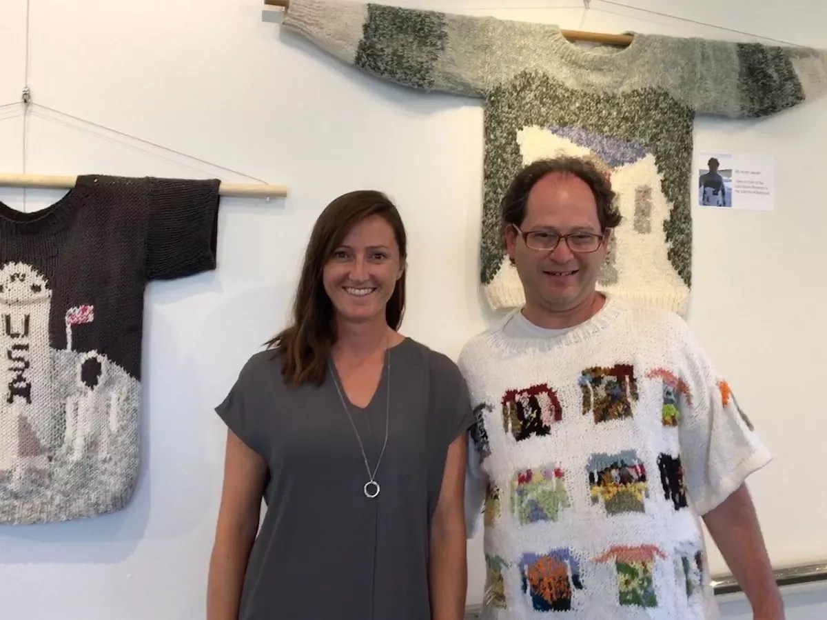 Jaime with Internet knitting celebrity Sam Barsky. Barsky recently had an exhibition at the Boulder Public Library, and Kopke made four sweaters available for check-out on patrons’ library cards.