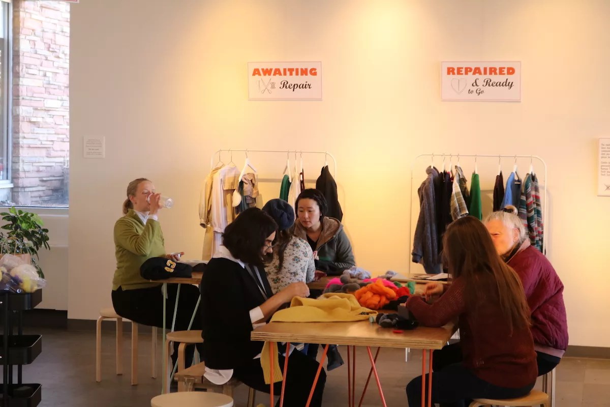 Library patrons mending clothes at the Sew for a Stranger portion of the Art of Repair exhibition.