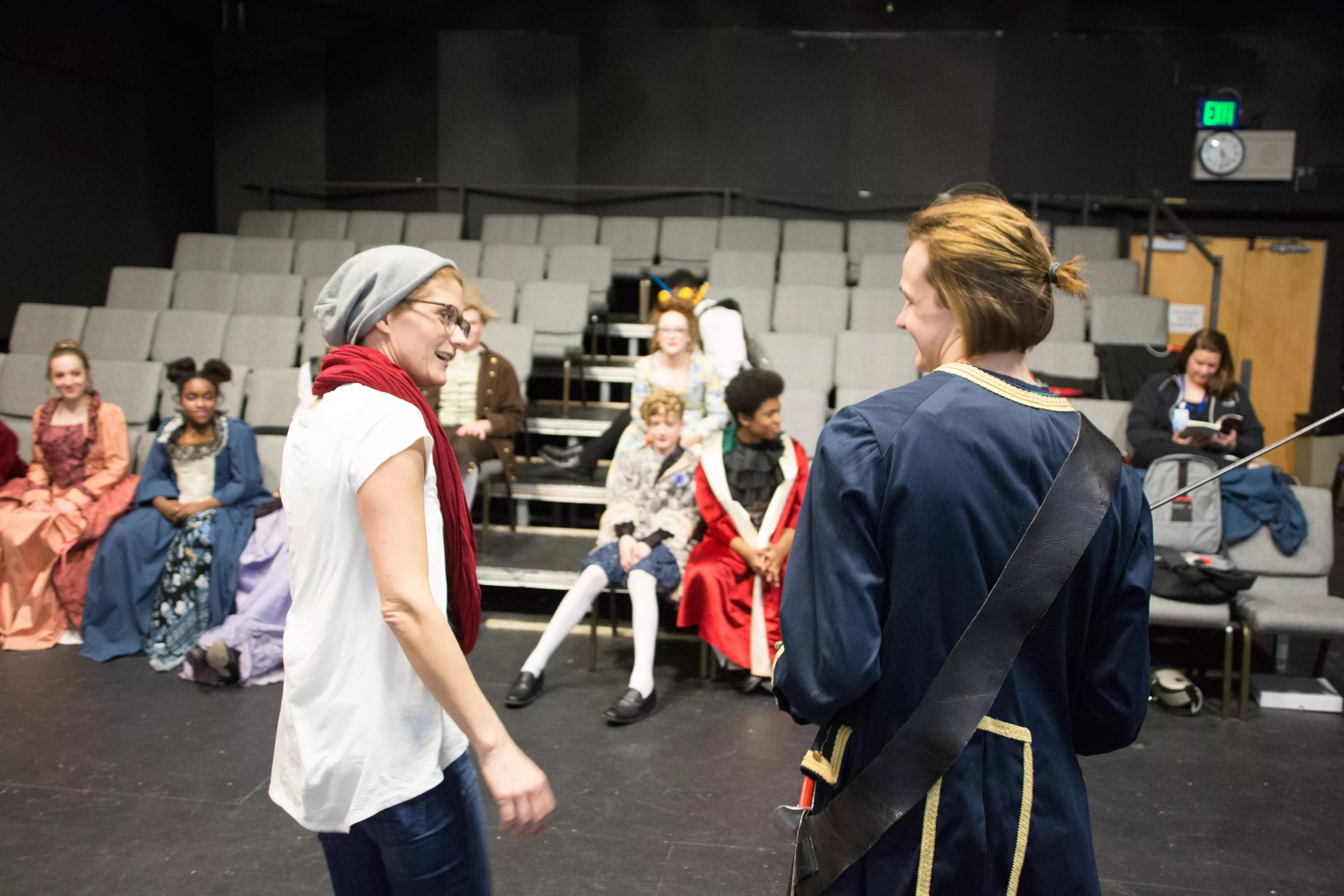 Austgen directs The Bourgeois Gentleman with assistant director Cammy Seefried at Denver School of the Arts.