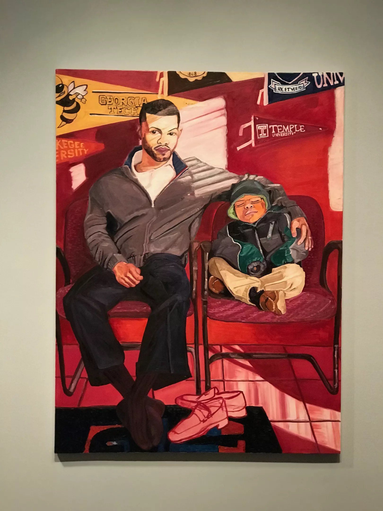 Arranged in a way that intercuts older pieces with newer ones, out of formal chronology, Returning the Gaze works its magic right from the start. “The first painting you see is called ‘Benyam,'” Casteel explains. “It’s a portrait of a family that runs an Ethiopian restaurant in Harlem that I frequent a lot, so the present is what hits you first. Around the corner, there’s a portrait of my mom and other work made in Denver, some of them addressing relationships between black men: fathers, sons, brothers, cousins. Then you come around another corner and get a sense of the paintings I made as I transitioned to Harlem.