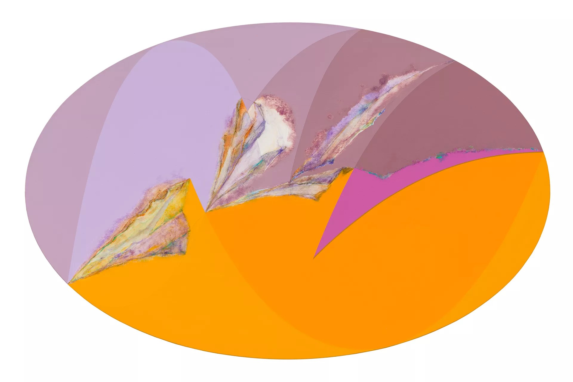 Indeed, equations take on a large role in YÅ«st’s process. His sketchbooks contain line after line of algebra in search of angles, curvatures and points along a vector, demonstrating the precision with which he approaches his work. His earlier compositions are done on rectangular canvases, where he developed the biomorphic abstractions seen in the circular and, from 2006 to 2019, elliptical canvases of his later years.